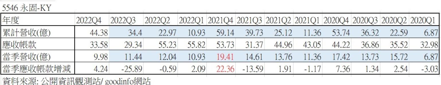 根據永固KY截至去年第三季的財報,累計營收34.4億元台幣,但去年,也就是2022年第三季所有應收款項合計為31.49億元,其中有29億元為應收帳款,已經占84%,在2022年上半年這個數字更誇張,應收帳款55.23億元,營收為22.97億元,應收帳款為營收的一倍,這是一千多家上市櫃公司中少有的。