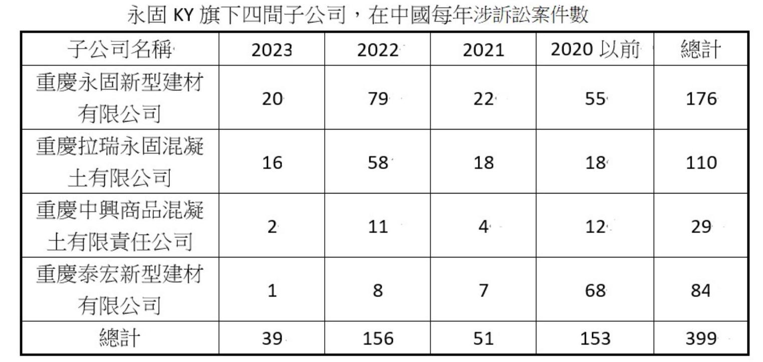 根據「企查查」網站上公開資訊,2022年第一季永固ky四大子公司重慶永固新型建材、重慶拉瑞永固混凝土、重慶中興商品混凝土有、重慶泰宏新型建材等訴訟案件為64件,到2022年年底累計訴訟案件達134件。