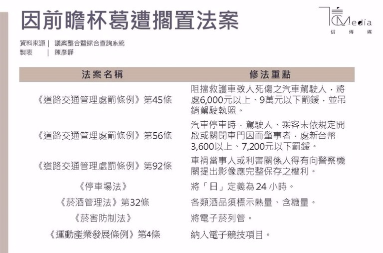 但20日來的焦土作戰,導致議事多次停擺,許多與民眾生活相關的法案都被延遲,例如隨意開車門肇事者將遭罰3,600元以上,以及酒品須標示熱量、含糖量,或是將電競項目納入運動產業等修法,都被延遲了;其中還有不少法案是藍黨團或立委所提。