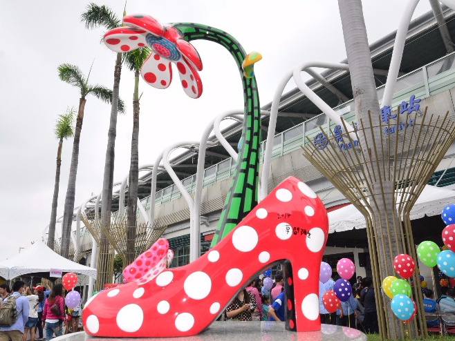 由有著「日本當代藝術教母」稱號的草間彌生 (Yayoi Kusama)為員林車站量身打造的《踩著高跟鞋出發,去見我的男朋友》一作,以滿綴著繽紛白色圓點的豔紅色高跟鞋裡頭,綻放出一朵可愛小花的意象,傳達出少女想見到男朋友的熱切心情, 更與當地盛產蜜餞(台語叫做鹹酸甜,即又酸又甜的滋味)的地方特色巧妙結合,成為人們競相造訪 的熱門地標。