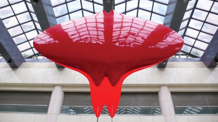 如果來到板橋車站,絕對不容錯過藝術家黃銘哲精心創作的《慾望在飛行》與《穿梭時空的八種要素》兩件造型奔放、用色大膽的作品。前者懸掛在大廳中庭,是一個高達12公尺,猶如巨型不明飛行物的立體裝置;後者紡錘般的尖錐造型裝置自一樓向下倒垂至地下一樓通道,不僅十分引人注目, 更激發來往旅客對於每一個旅次可能發生的情節想像。