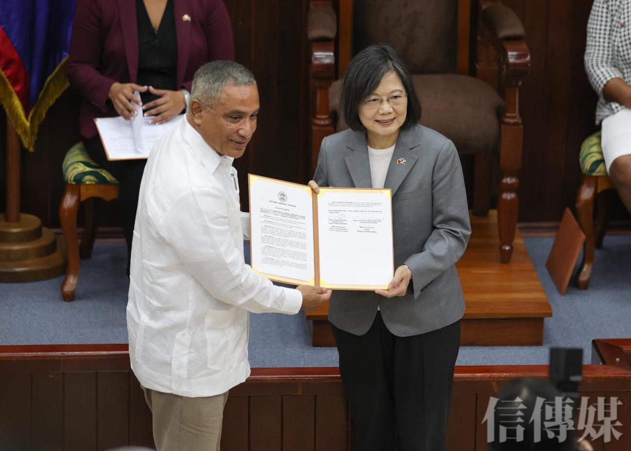 蔡總統「民主夥伴共榮之旅」第2站訪問友邦貝里斯,當地時間3日上午(台灣時間4日凌晨)抵達貝國外交部,見證台貝兩國外長簽署雙邊技術合作協定暨五千台筆電贈交儀式,隨後也在貝里斯國會發表演說。