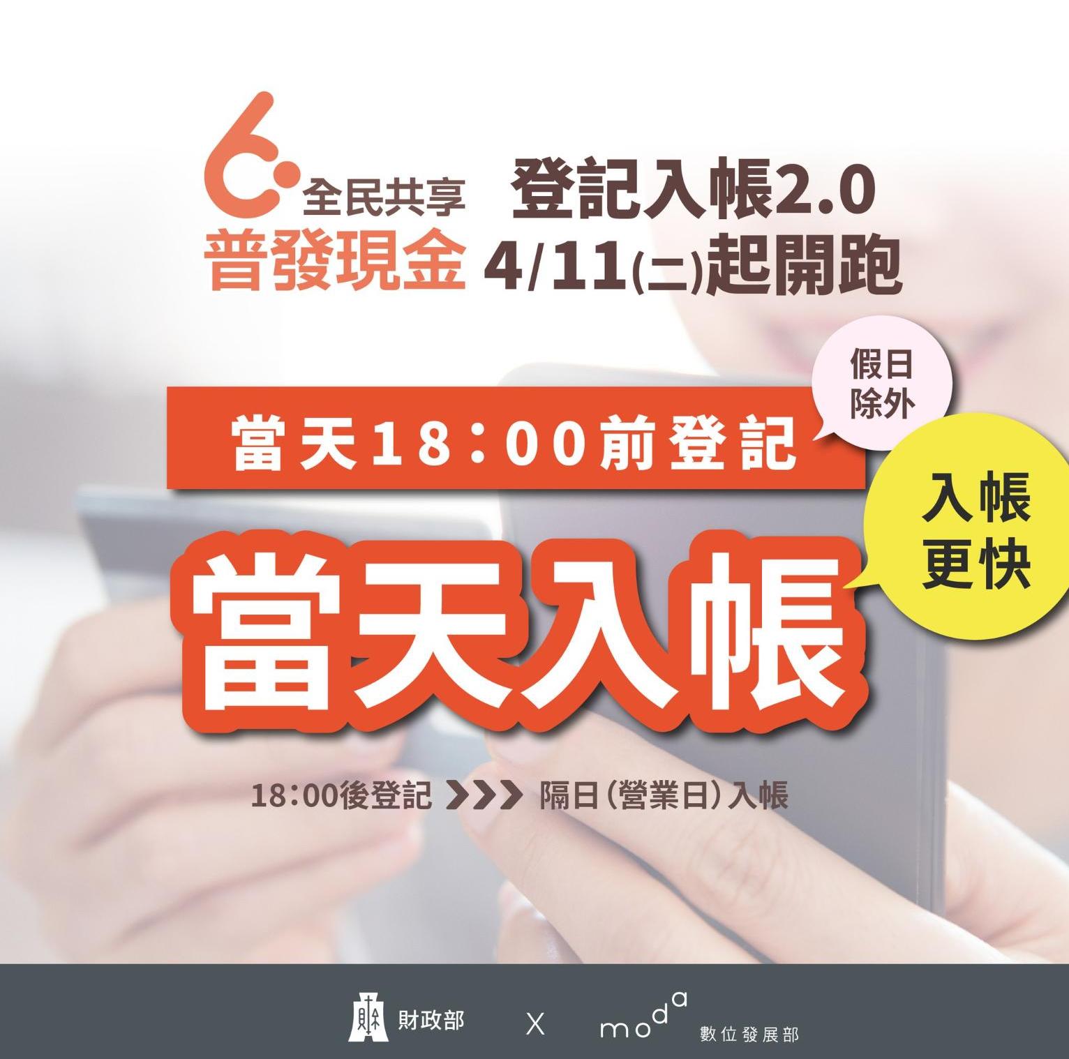 第一波沒登記到的民眾也沒關係,財政部將在4月11日推出登記入帳2.0版本。為了讓登記入帳的方式可以更快入帳也方便更多人,4月11日起,只要上網完成登記,系統檢核帳號資料無誤的話,當天的晚間6點前登記,當天就會入帳;當天晚間6點後完成登記,也是隔天就會入帳了。