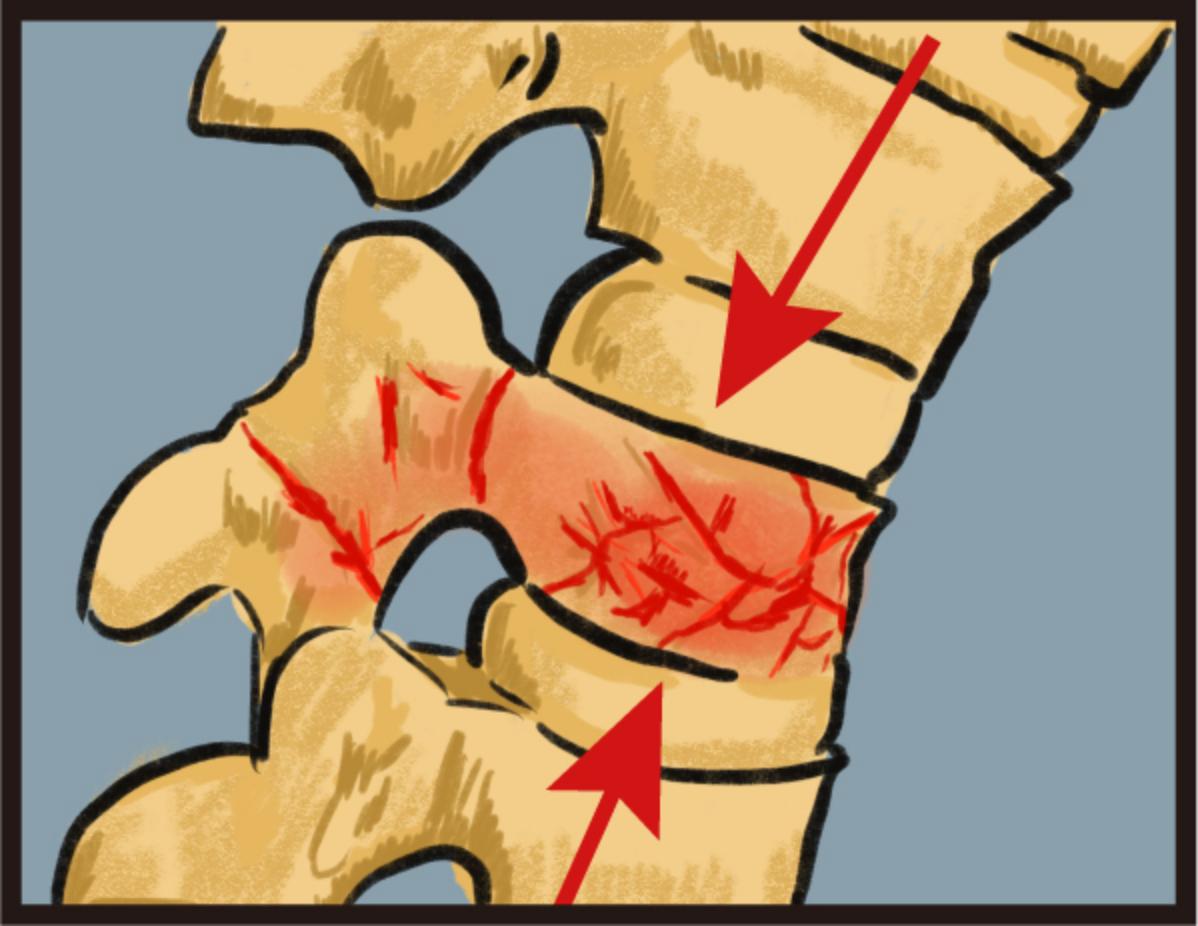 這個問題,可以從脊椎骨的構造來瞭解。其實壓迫性骨折,只是脊椎骨折的其中一種,另外還有爆裂性骨折、彎曲伸展性或稱安全帶骨折、還有移位性骨折。脊椎骨的構造,就好像一落一落的積木疊在一起,積木的主體稱為椎體,椎體和椎體一節一節堆疊,中間有稱為椎間盤的軟骨提供緩衝的作用。而椎體往後就是一圈骨性的結構稱作椎管,是脊髓通過的管路,再往後伸出脊椎骨的尾巴的是稱為棘突,指向身體的正後方,在較瘦的個案身上可以從表面摸到棘突的突起。