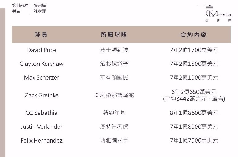 先看看大聯盟七張先發投手最高金額合約(以合約總額排名):