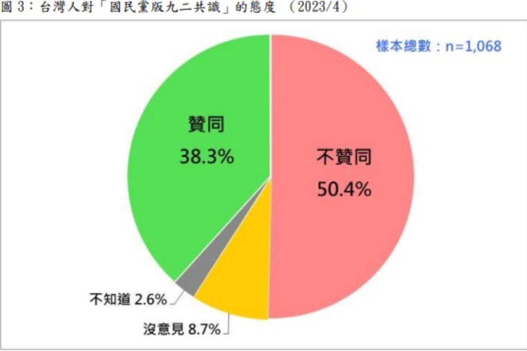 至於對國民黨版「九二共識」所強調,兩岸同屬「一中」,「一中」就是中華民國的說法,有17.1%非常贊同,21.2%還算贊同,20.6%不太贊同,29.8%一點也不贊同,8.7%沒意見,2.6%不知道、拒答。