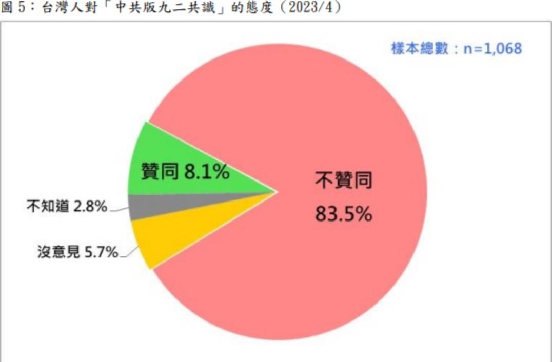換句話說,有高達8成4不贊同,其中,強烈反對有6成2,贊同的僅有8.1%,台灣民意基金會董事長游盈隆強調,不接受「中共版九二共識」,已是接近是台灣全民共識。