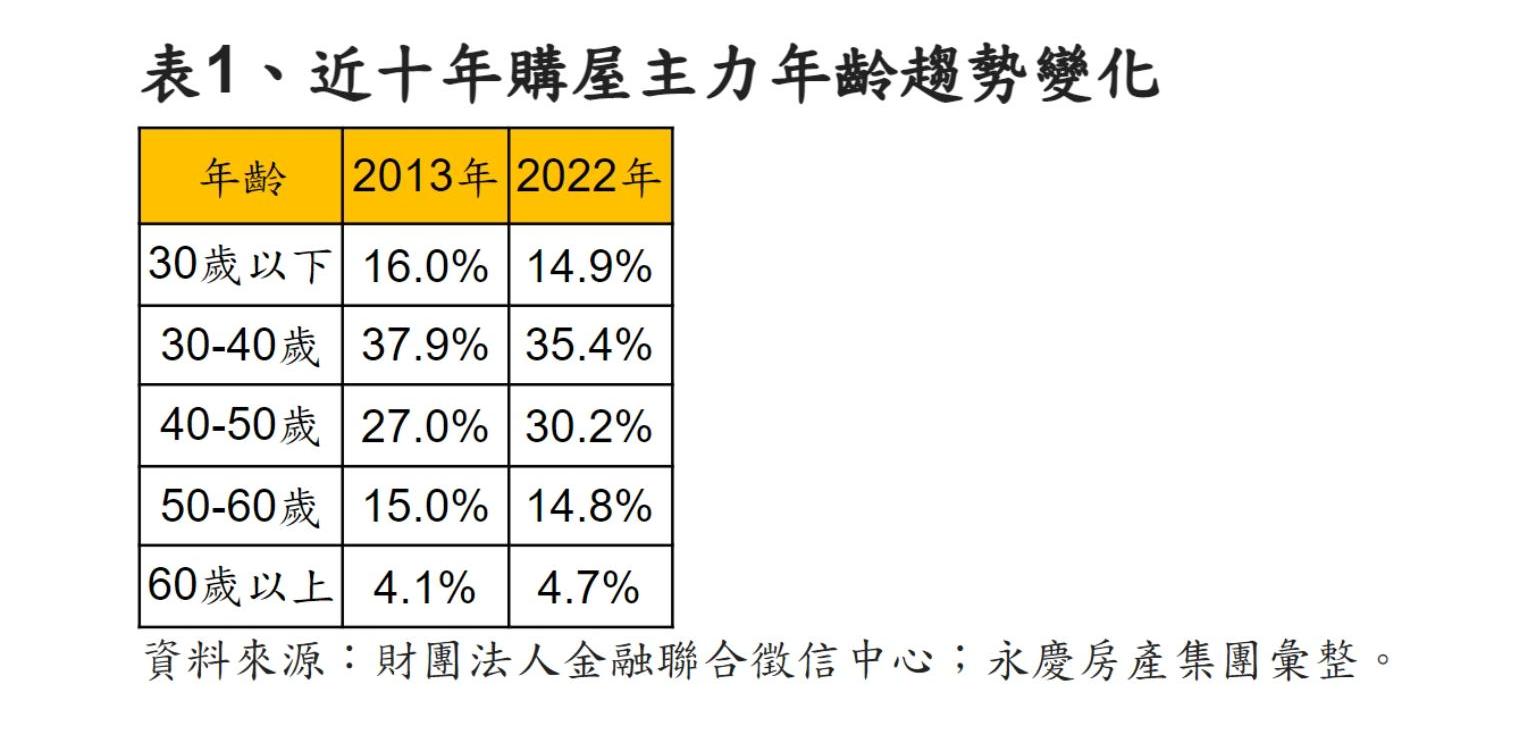 永慶房產集團根據財團法人金融聯合徵信中心資料統計,觀察近十年主力購屋年齡趨勢態樣,發現2013年購屋主力是30-40歲的族群,占比為37.9%,其次是40-50歲的27.0%,但2022年購屋年齡主力雖仍以30-50歲為主,但30-40歲占比下降,反而是40-50歲明顯提升3個百分點,買房年齡有愈來愈高的趨勢。