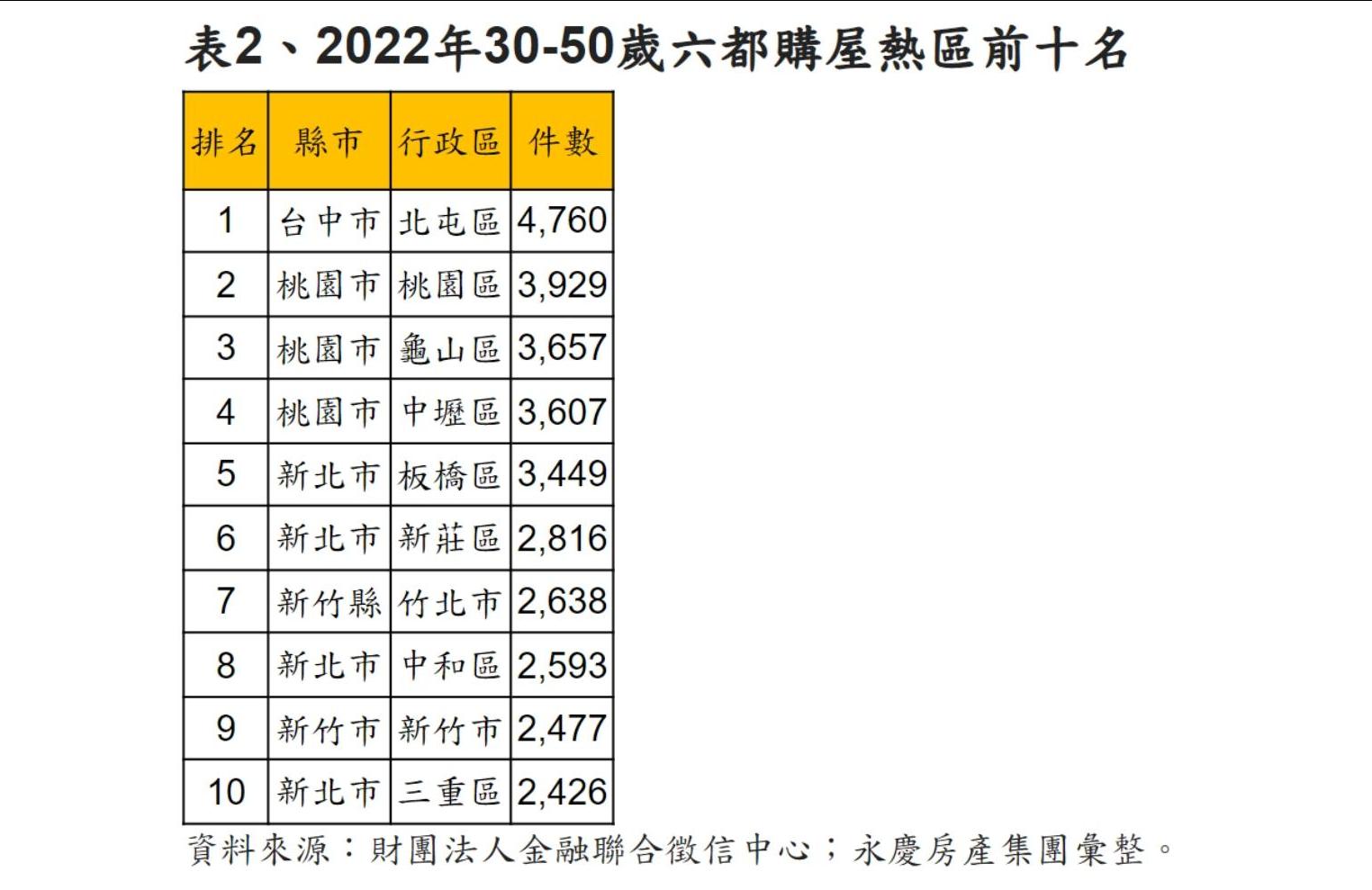 另針對六都30-50歲購屋熱區進行探討,篩選出前十名行政區,結果顯示該年齡層購屋熱區前三名依序是台中市北屯區、桃園市桃園區與龜山區,前五名中桃園市就囊擴3名,若以前十名來看,則以新北市入榜4個行政區最多。陳金萍指出,台中市北屯區以4760筆居冠,擁有捷運綠線經過,便捷交通與完善生活機能,加上重劃區題材多,推升房市交易。而桃園市桃園區吸引不少在雙北市就業的民眾進駐,通勤往來相當方便,加上北北桃通勤月票上路後,有機會吸引更多首購族選擇前來購屋居住。至於第三名的桃園市龜山區則有A7重劃區,地理位置靠近新北市林口區,但房價比機場捷運A8、A9站周邊低,加上桃園市社會福利佳,吸引自住人口進駐,甚至吸納來自雙北市的購屋族,成為30-50歲購屋熱區第三名。