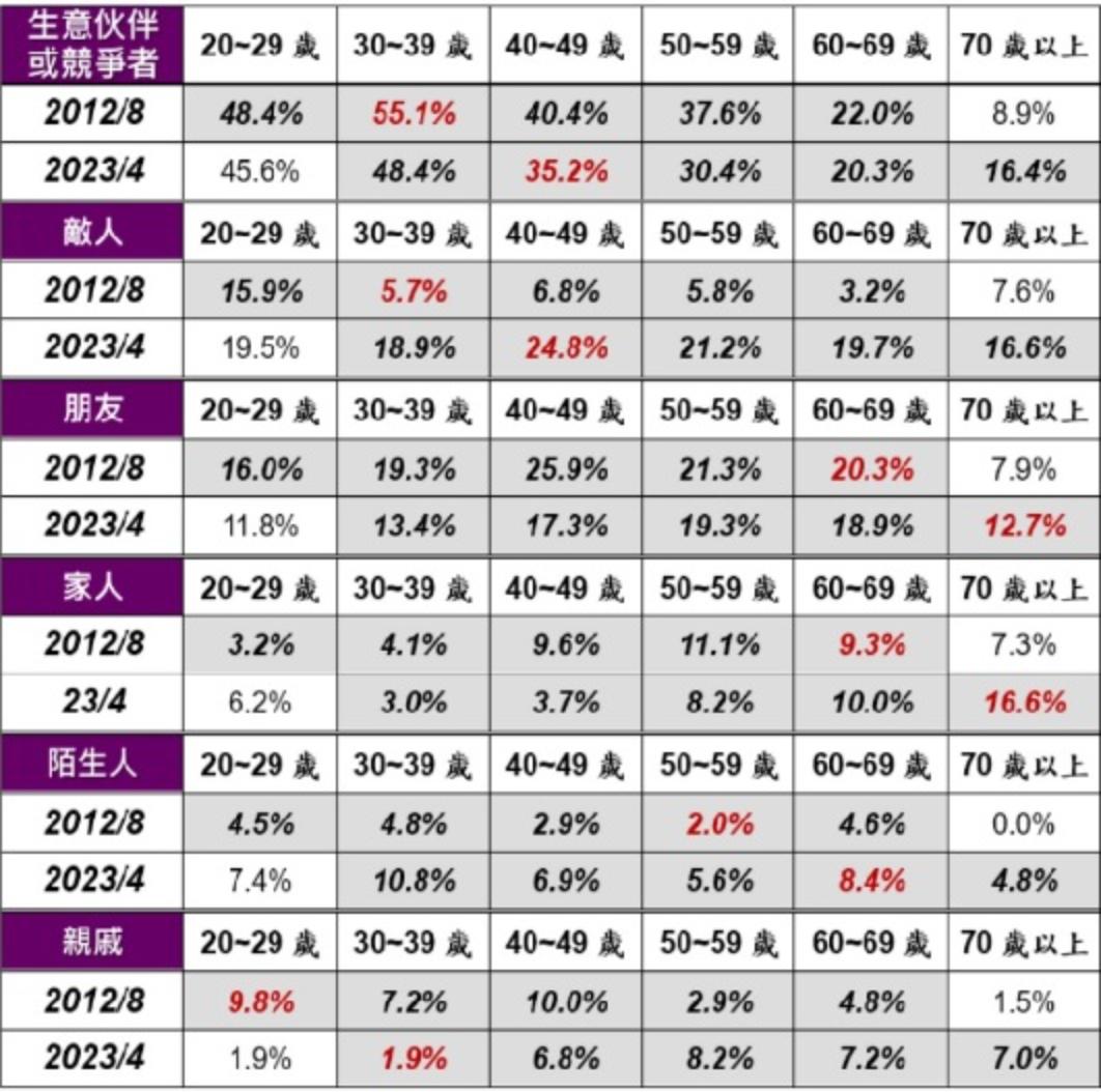 民調顯示,政權輪替後民眾認為兩岸終將成為敵我關係的比率,增加12.7%,其次。生意伙伴或競爭者,則減少6.1個百分點