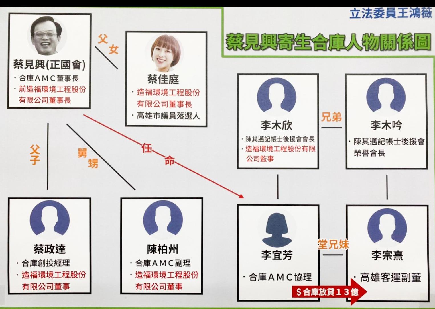 言下之意,王鴻薇指控,蔡見興等於把自己整個家族、造福環工的董事會成員都寄生在合庫AMC公司之下,把公營事業變成他自己的「家族事業」,背後動機不言可喻。