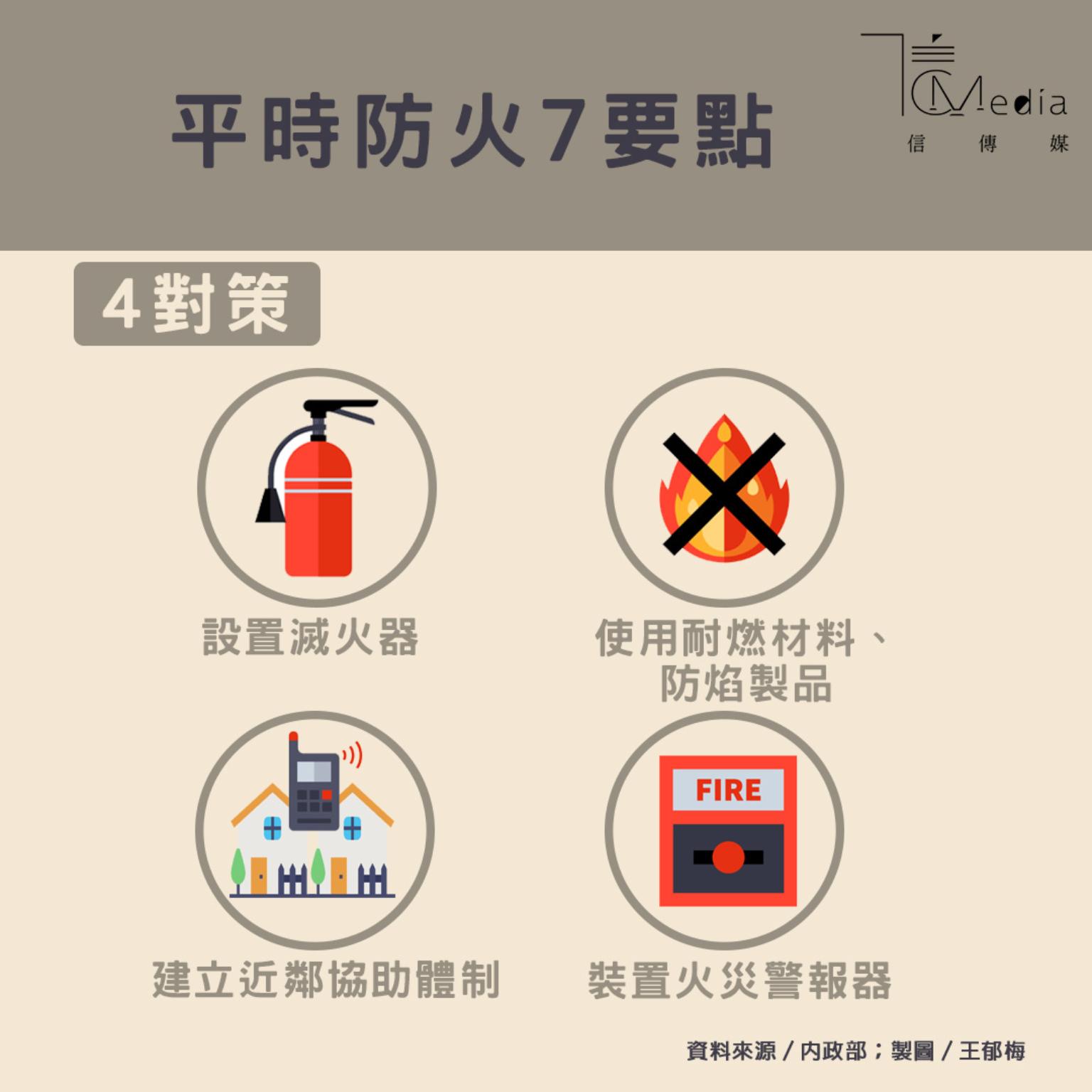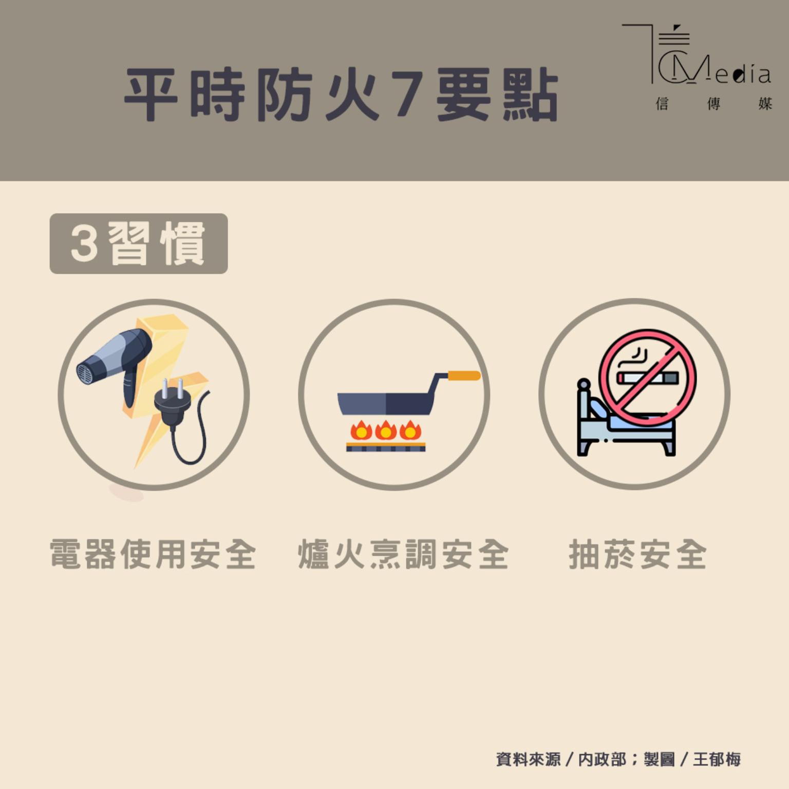 內政部表示,火災預防平時就要做好準備,千萬不可疏忽大意,務必遵守用火電「3習慣」及防火逃生「4對策」共7要點,以確保居家安全。
