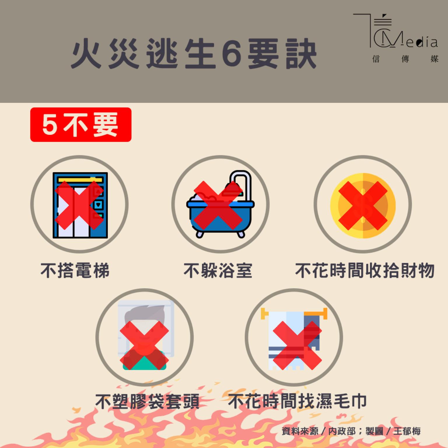 過去訪間流傳遇到火警找濕毛巾遮口鼻、用塑膠袋套頭、躲在浴室等,都是錯誤的逃生觀念,若不幸遇到火警,請記得「5不1原則」的應變逃生6要訣: