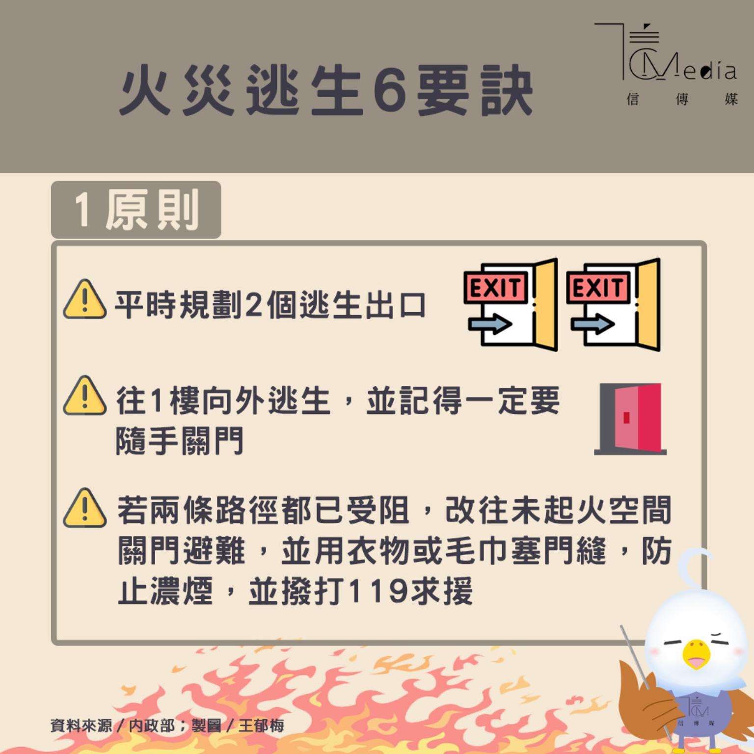 若不幸遇火警,如何才能保命?內政部曾提醒民眾,平時要做好居家防火安全,包括養成安全用火電習慣、使用耐燃材料裝修及安裝住警器、滅火器等預防7要點,加上往1樓逃生等6要訣,以確保自身及家人的安全。