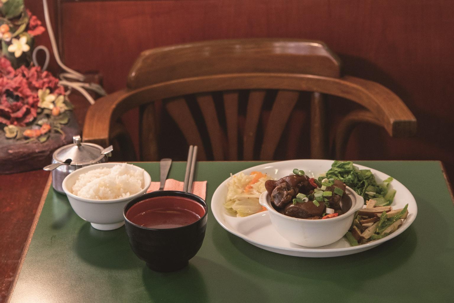 而位於青島東路上的「青島蜜蜂咖啡」自1978年開業至今,不單是咖啡飄香,另一種濃郁的香氣則是來自老闆娘的台味拿手菜!手寫菜單、具年代感的裝潢,訴說著40年來的餐廳風格。Hally首推這裡的扛壩子招牌餐「豬腳飯」,以台灣黑毛豬腳用糖、醬油文火上色40分鐘,再紅燒燉煮1、2個小時,是附近上班族、居民都知道的經典美食。
