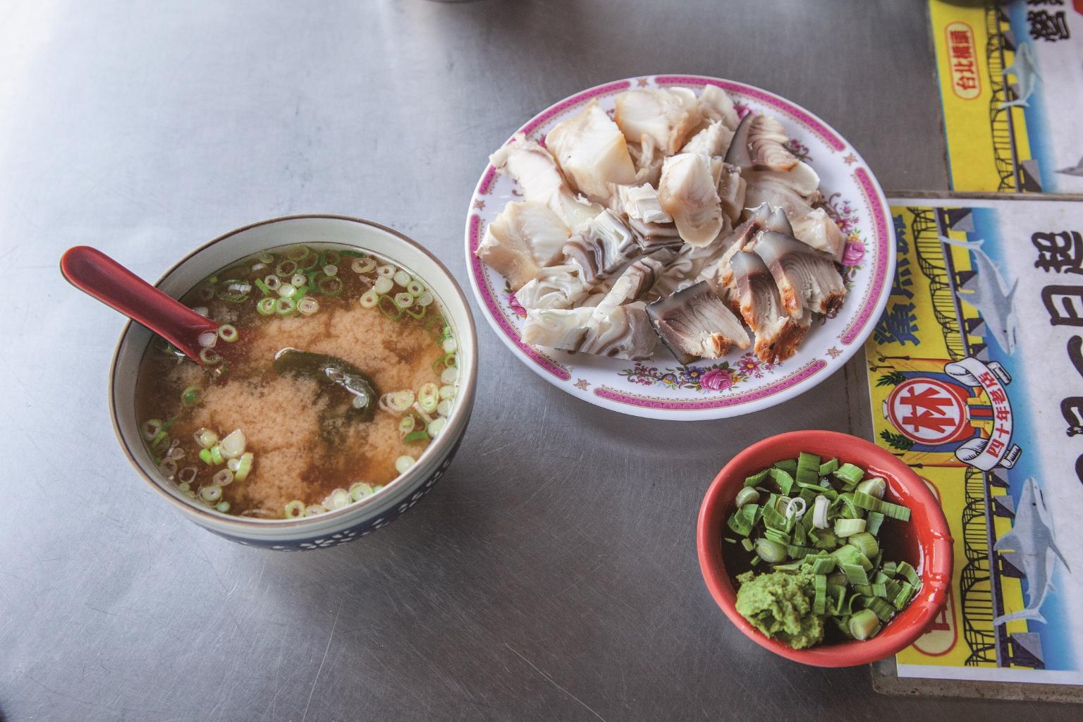 Hally建議第一次來嘗鮮的饕客,可以點份由鯊魚肉、魚皮所組成的綜合拼盤,淡淡煙燻味與具嚼勁的魚肉、Q滑的魚皮,一盤就能享受不同風味。「俗稱『QQ』的頭部透明膠質是我的最愛,蘸上獨家特調芥末蔥醬油,胃口再差的炎夏也會有食慾。」