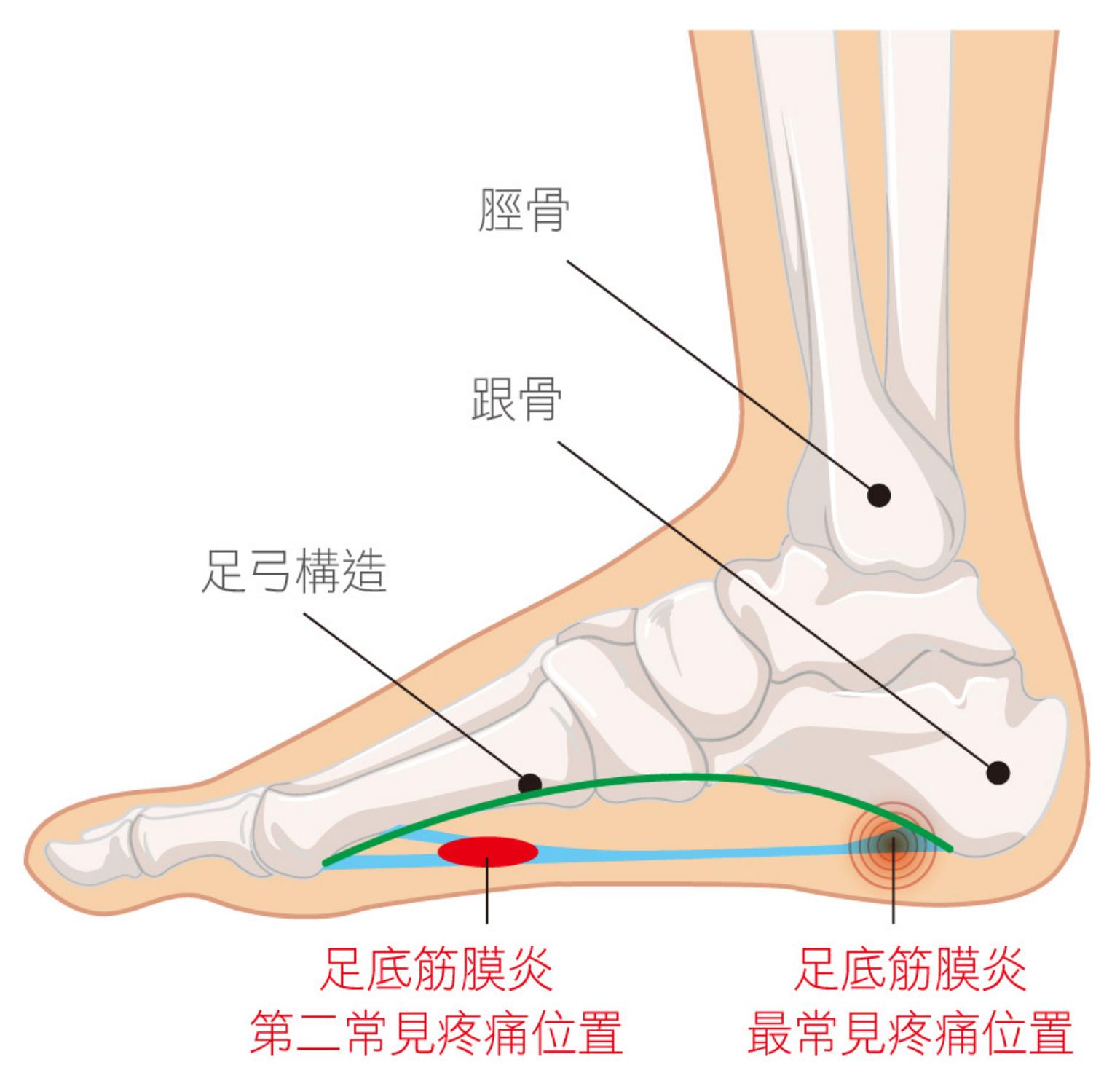 腳底大部分是走久了出現疼痛感,主要為足底筋膜炎。大部分人的腳底為弓型構造,有一條足底筋膜,類型弓弦的功能,具有彈性,可能因年紀增長而逐漸失去彈性,或是走太久而彈性疲乏。 通常腳跟疼痛較多(約70%),有30%則是痛腳底的前段。