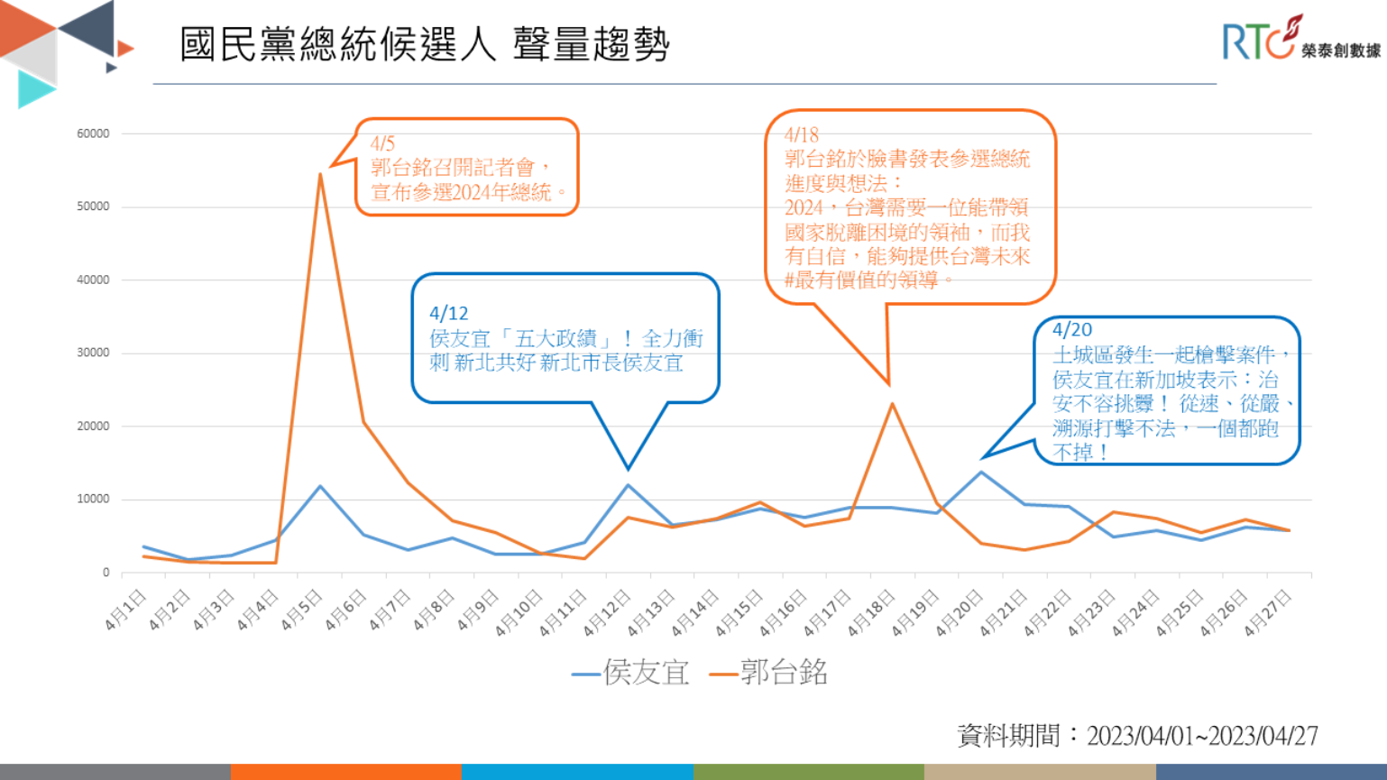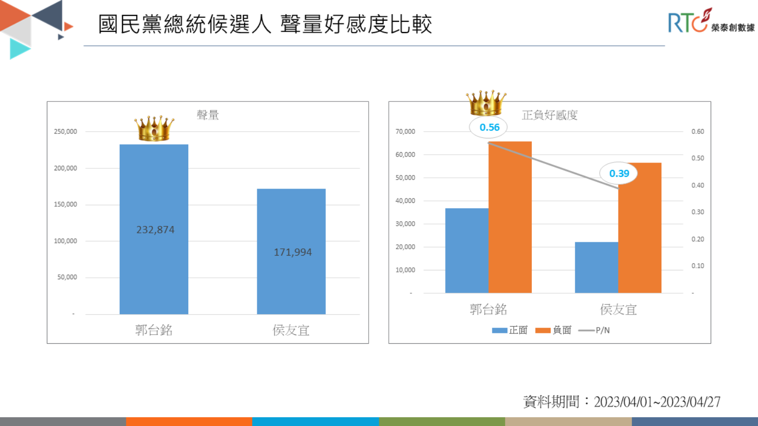 《榮泰創數據》表示,雖然郭台銘近1個月的聲量高於侯友宜,主要來自於4月5日宣布爭取參選國民黨代表的聲明,其餘大部分時間兩人聲量相近;不過以好感度來觀察,郭台銘則高於侯友宜,以聲量及好感度來看,郭台銘目前情勢似乎比侯友宜來的好。