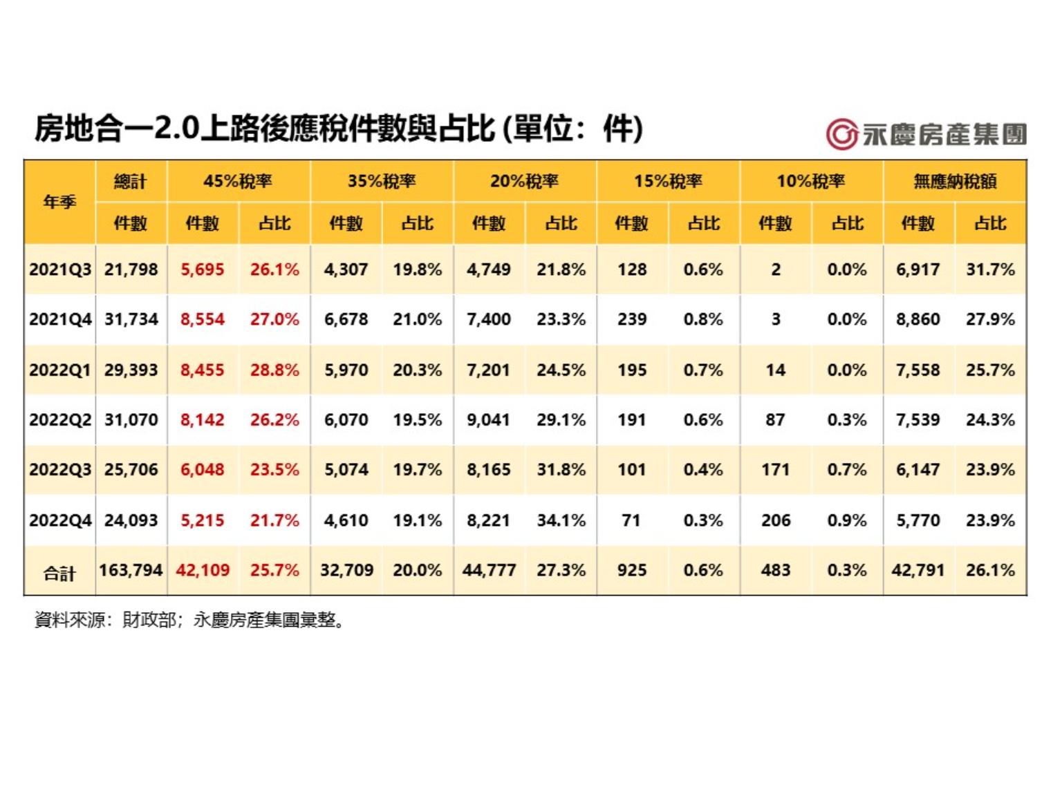 永慶房屋業管部協理陳賜傑表示,財政部資料顯示,自2021年7月《房地合一2.0》上路之後,遭課徵45%稅率的房市短期交易案數依舊持續增長。直到2021年年末內政部提出《平均地權條例》修正草案,對投機客產生嚇阻作用,才使房市短期交易案從2021第四季的8,554筆開始逐季下降至2022年第四季的5,215筆。