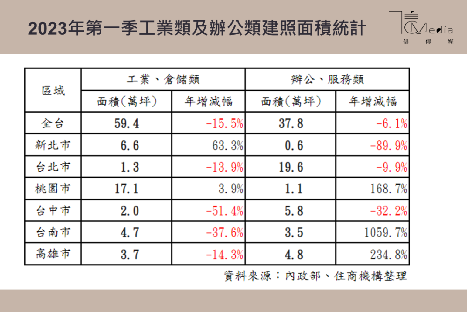 近年商辦及工業、倉儲需求高,使照面積在去年寫下大量,但今年首季出現下跌,工業、倉儲類今年第一季建照面積共59.4萬坪,跟去年同期相比減少15.5%,辦公、服務類第一季建照面積37.8萬坪,年減6.1%,兩大不動產熱門類型並未在今年續創新高。