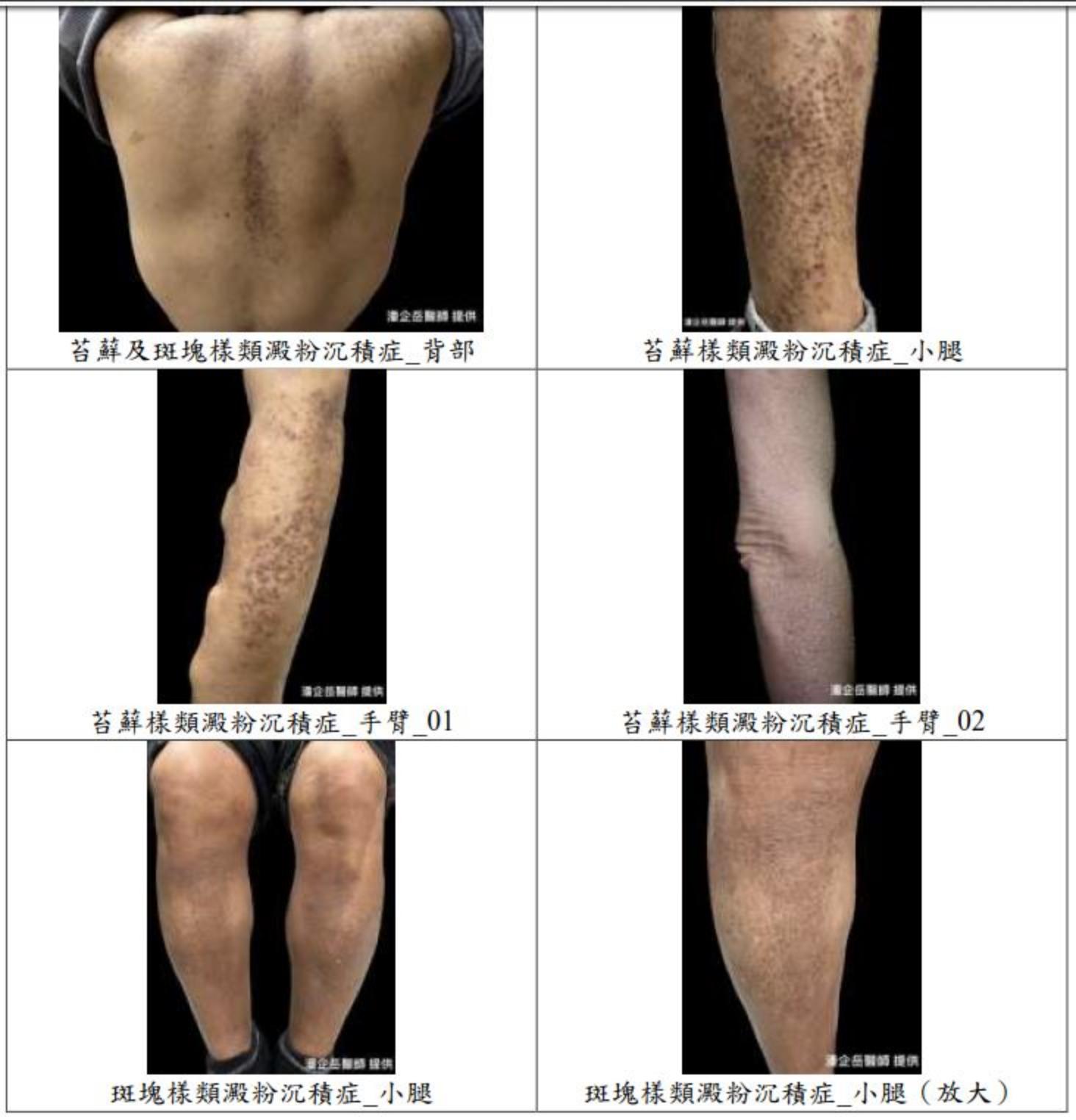一位60多歲男性,因為皮膚色素斑塊及難看的顆粒前往就診,其問題存在長達5年之久,而且是經常性的搔抓。經皮膚檢查發現問題部位集中在小腿、左臂外側、背部等容易搔抓的部位,這些部位呈現棕色斑塊,上面佈滿了角質化顆粒,外觀猶如癩蛤蟆皮。另一案例為中年男性,因手臂癢而長期搔抓,皮膚也是密布顆粒狀突起。再一案例為50多歲男性,小腿、手臂、背部癢了20多年,也是長期搔抓並產生漣漪狀的色素斑塊以及角質化顆粒。以上案例皆為典型的皮膚類澱粉沉積症。