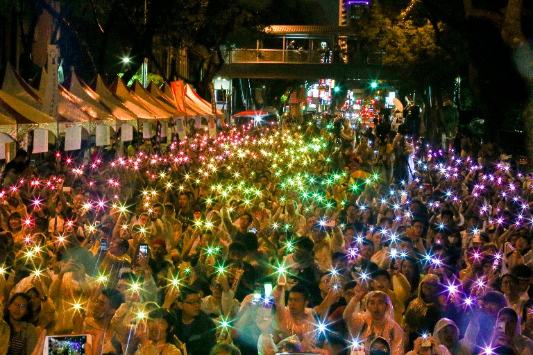 立法院旁青島東路上音樂也隨之響起,「點亮台灣,亞洲燈塔」活動也接著拉開序幕。