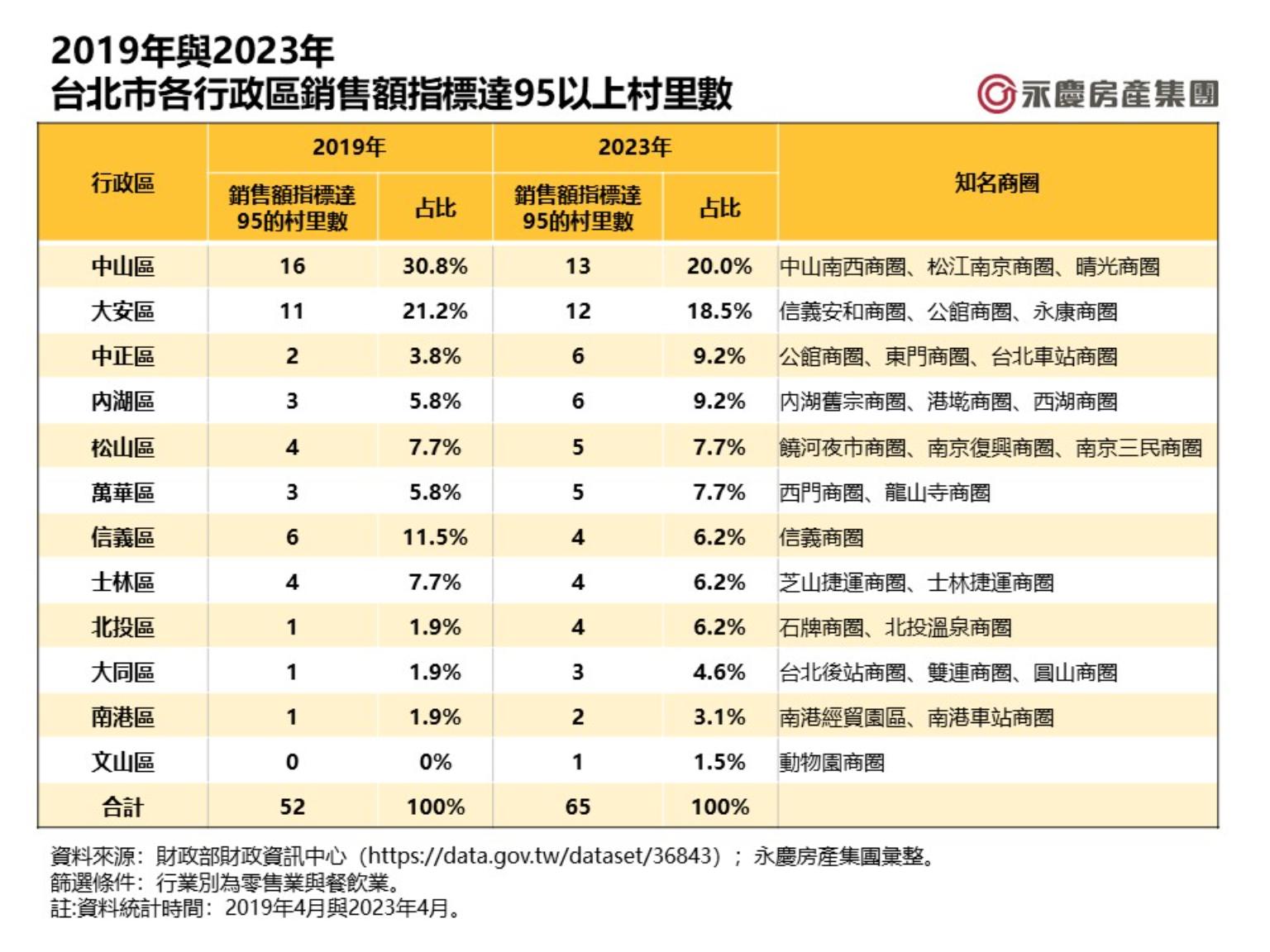 永慶房屋比較2019年和2023年財政部公布的銷售額指標超過95的村里和隸屬之行政區,發現中山區和大安區擁有最多村里數,顯示中山區和大安區仍為台北市重要的消費核心區域。而以中正、萬華、大同三個行政區為代表的台北西區,在五年間銷售額指標超過95的村里增加眾多,顯示台北西區的消費力道增長迅速!