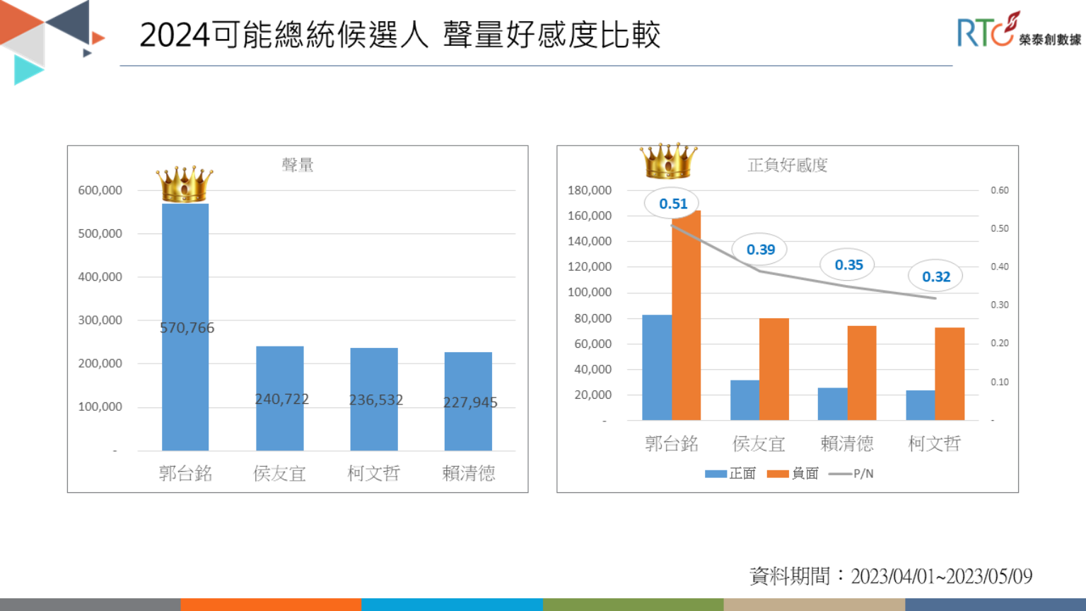 《信傳媒》與《榮泰創數據》合作,針對可能的總統候選人進行比較,從4月1日統計至5月9日,在近1個月的聲量中,郭台銘明顯高於其他人許多,好感度也是4人當中最高。數據顯示,郭的總聲量高達570,766則,是其他人的2倍之多;好感度0.51,也比其他人高出約30%以上。