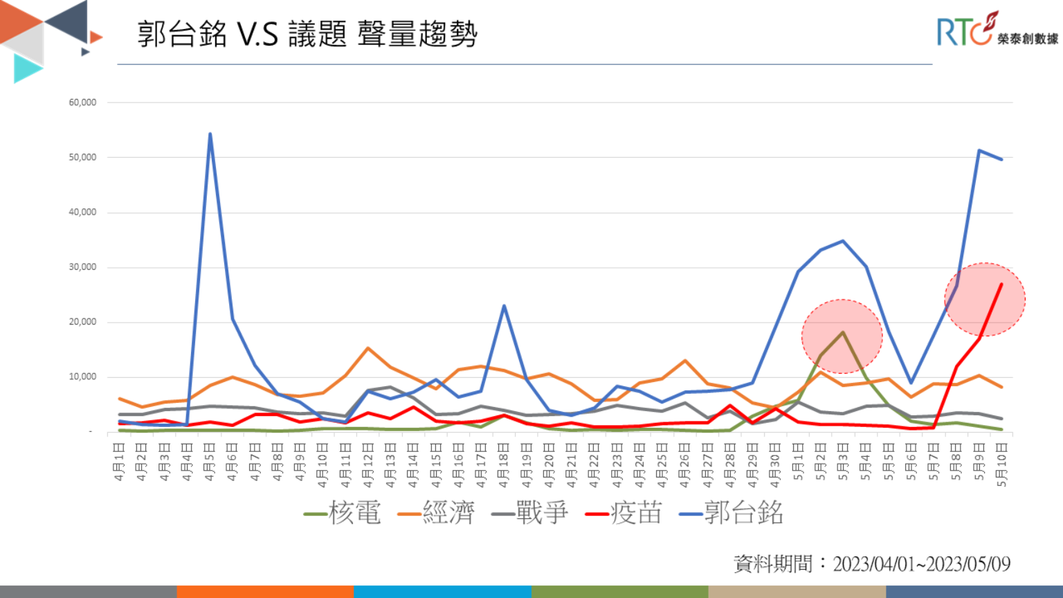 《榮泰創數據》指出,郭台銘在這段期間積極造勢,一方面大力拉攏國民黨人士,一方面試圖吸收韓粉,從個人聲量來看,宣布要參選總統後,聲量的確一波比一波高,不過從聲量的內涵來看,後面的兩波聲量高峰來自於核電議題以及疫苗採購,核電問題由於政府無法解決缺電的疑慮,顯示目前的熱度是民眾對於執政黨的不信任。