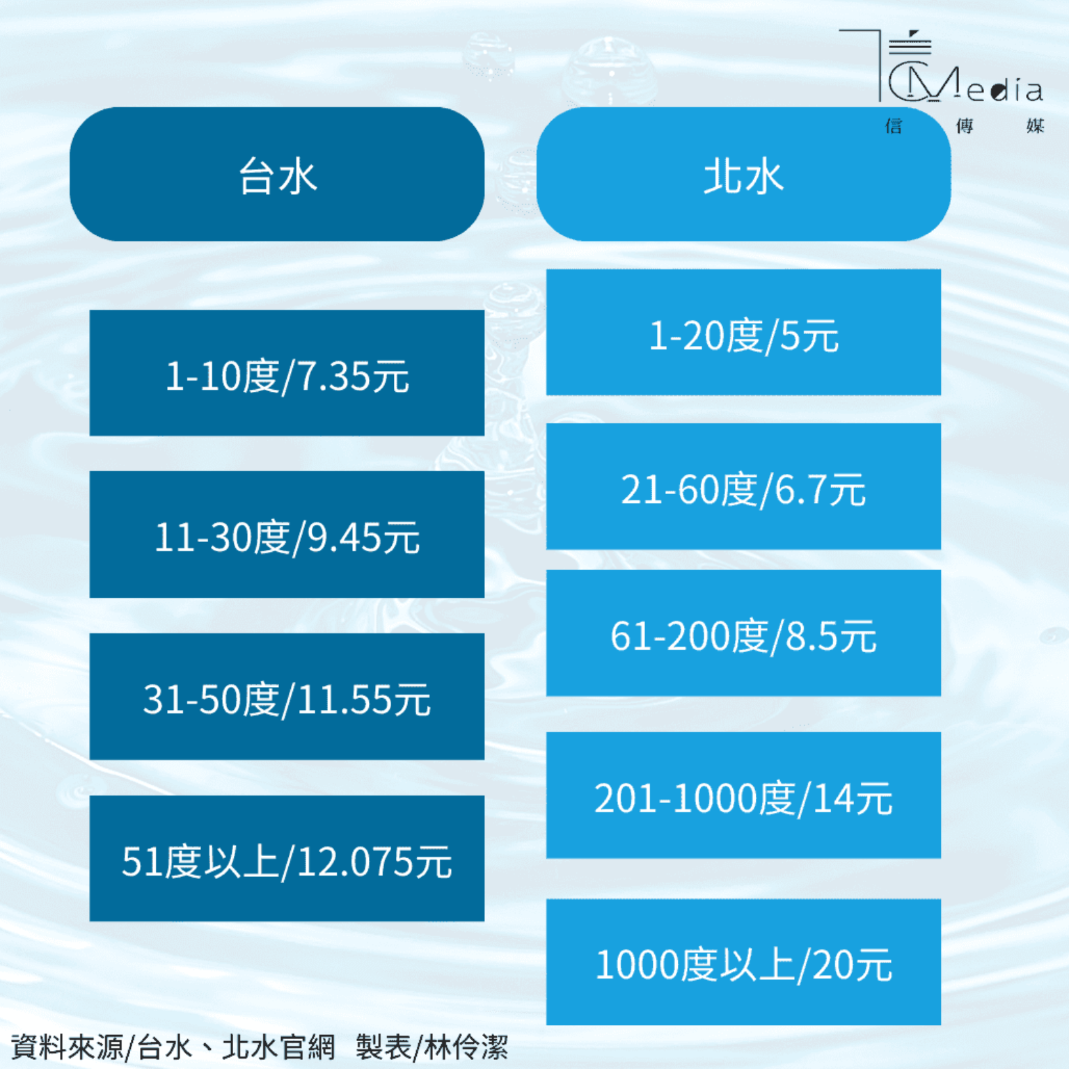 台水用水超過51每度的話,每度是收費12.075元,且4個級距的差異並不大。而北水用水超過200度每度就會收費14元,超過1000度,每度收費20元,級距之間的差異也頗大。