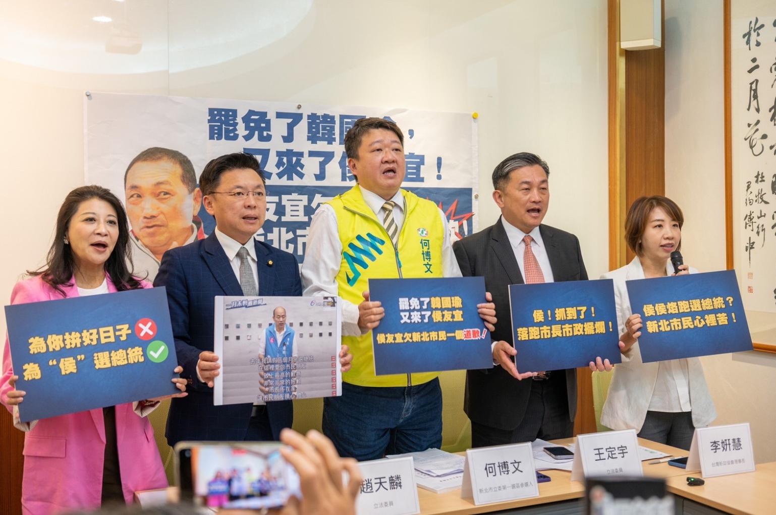 侯友宜昨天正式獲得國民黨提名參選總統,民進黨立委王定宇、趙天麟、林楚茵、新北市立委第一選區參選人何博文以及台灣新政協會理事長李姸慧於18日在立法院共同召開記者會,痛斥侯友宜「阿侯浪槓、背棄市民、新北市沒市長」!