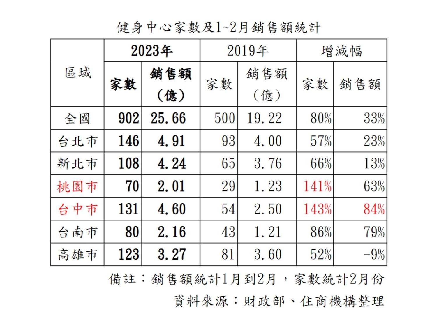 疫情趨緩後,國人外出意願大增,除了旅遊消費,健身活動也增加,全台健身中心家數大幅成長,依據財政部資料,今年2月全台共有902家健身中心,與2019年同期相比成長80%,六都中,台中市及桃園市店數成長超過一倍,業者相當看好疫後商機。