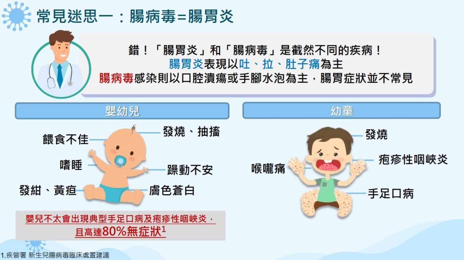 3. 以為腸病毒就是腸胃炎,殊不知腸胃炎表現多以吐、拉、肚子痛為主,腸病毒則以口腔潰瘍或手腳水泡為主,較少出現腸胃症狀。