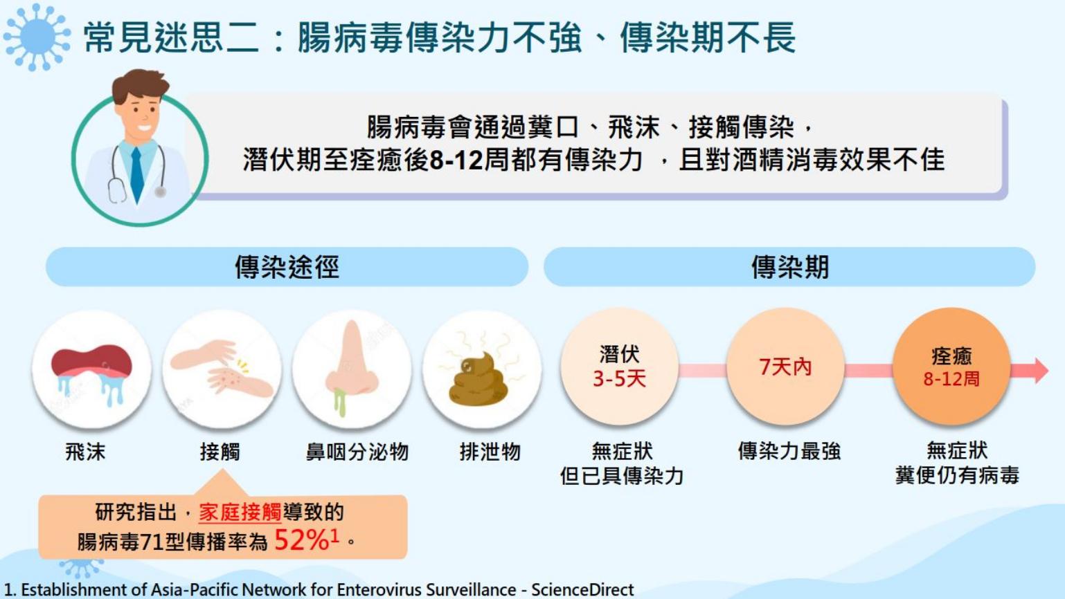 簡佳裕進一步解釋,腸病毒型別很多,即使得過其中一種,還是可能感染其他型別,「而且腸病毒傳染力強,超過5成來自家庭成員傳染,即家中的小哥哥小姊姊(大寶寶傳染給小寶寶),可透過飛沫、接觸、甚至是糞口傳染,即便看似痊癒,患者糞便仍帶有病毒,且傳染力可長達12週。」