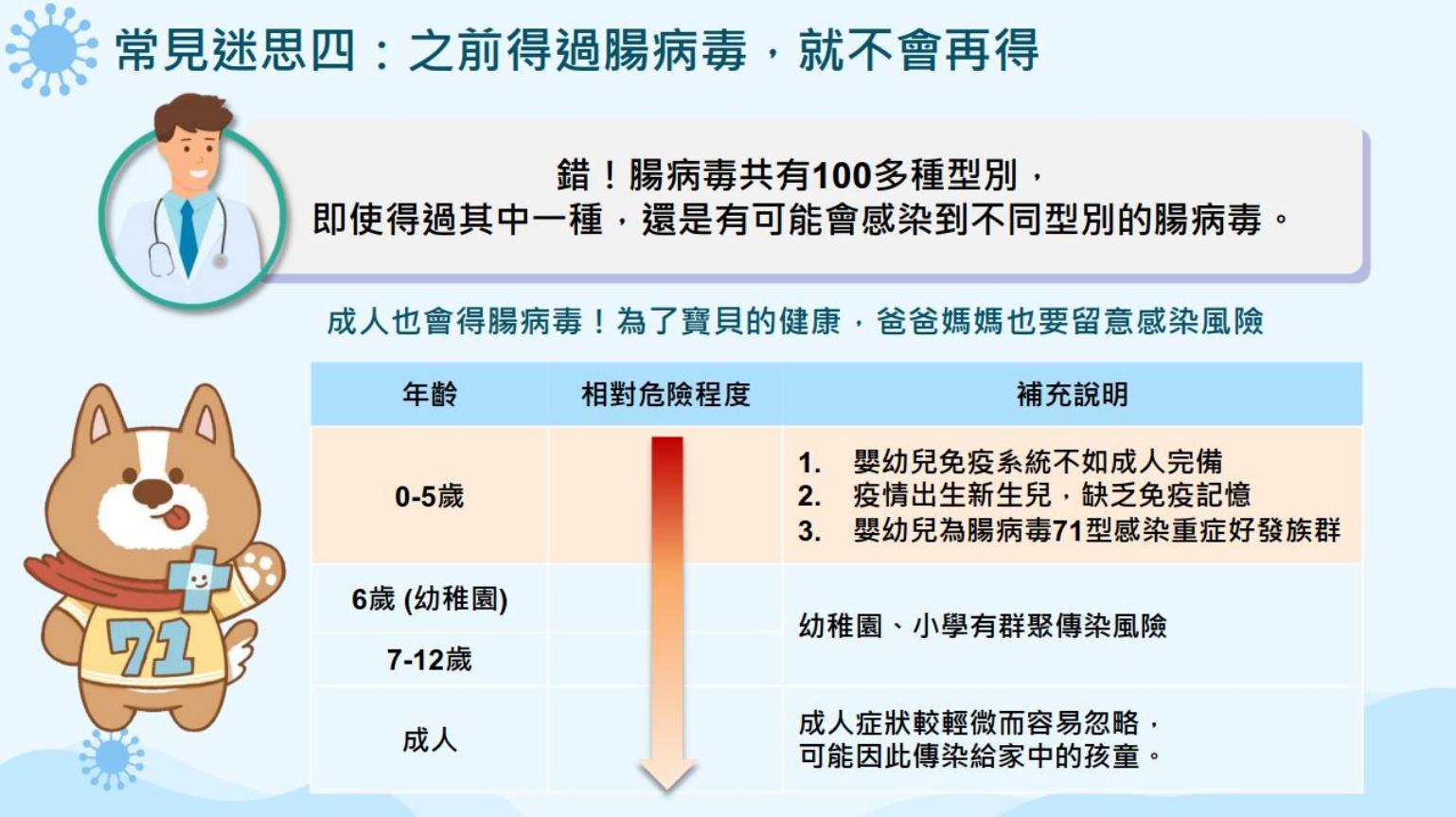 他進一步指出,9成的腸病毒71型重症皆為5歲以下嬰幼兒,且新生兒與幼兒感染症狀也略有不同,「除了發燒外,幼兒大多會出現手足口病或單純口腔潰瘍的疱疹性咽峽炎,但高達8成的新生兒均為無症狀感染;而且腸病毒病程進展快速,平均發病3天內便可併發重症,家長往往措手不及。」