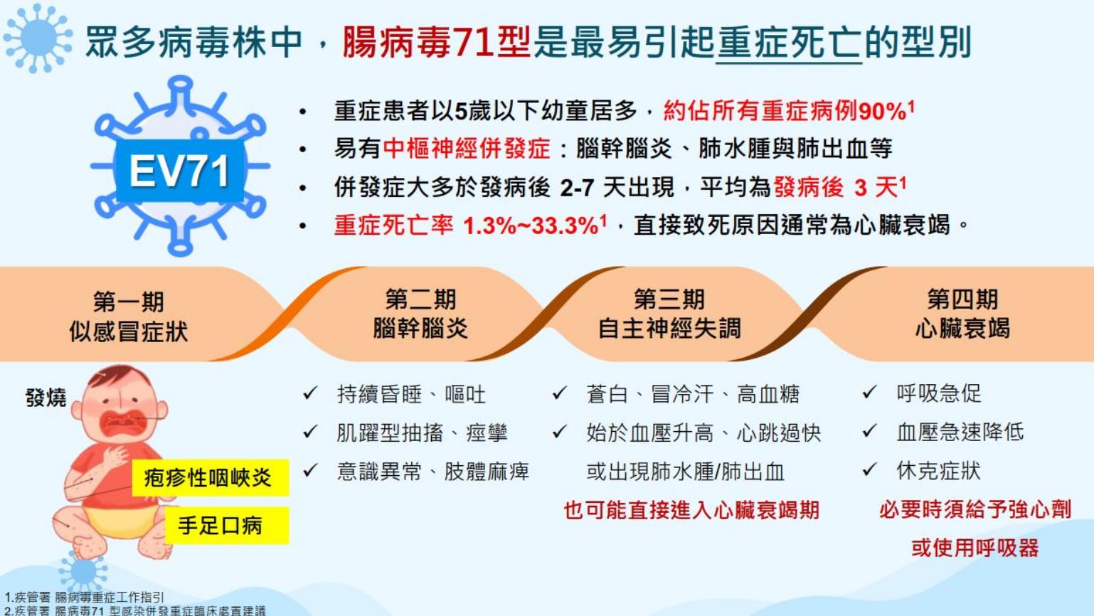 何美鄉解釋,腸病毒71型是國內歷年腸病毒流行之主要病毒株,也是亞太國家最常見引發重症的型別,其可怕之處在於會侵犯中樞神經系統造成腦幹腦炎、肺水腫與肺出血等重症,致死率更超過3成,直接致死原因多為心肌炎與腦幹腦炎。