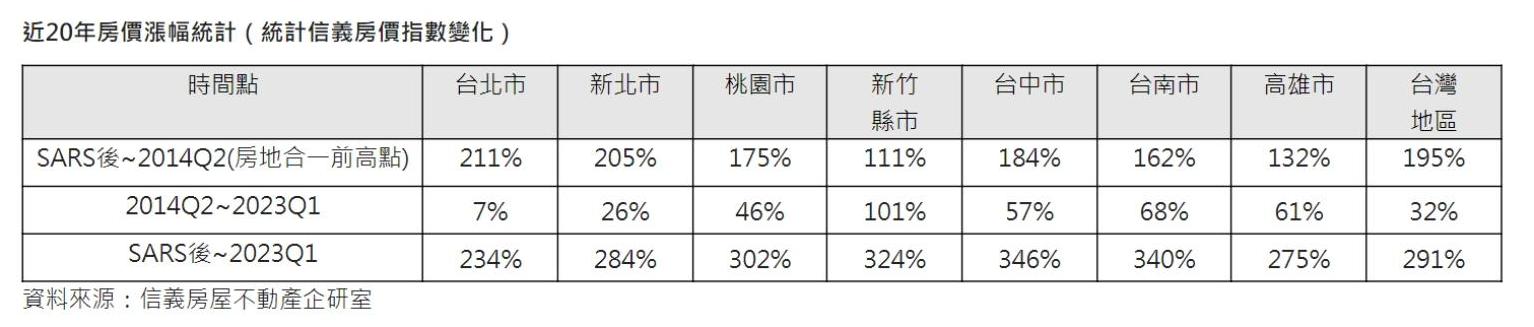 信義房屋統計SARS以來,房市20年的價格變化,六都加上新竹地區漲了234%~346%,房價上漲最多的是台中市,房價上漲346%,主要因為基期低加上重大建設到位與科技業等投資帶動;雙北市從SARS後到2014年第二季繼上一波的景氣高點,房價大漲了2倍,漲幅超越其他都會區。