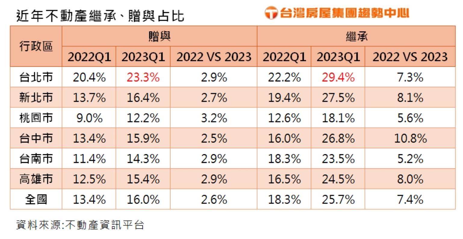 全國繼承的比例更高,達25.7%,較去年同期增加7.4個百分點,六都中繼承占比最高的也是台北市,達29.4%,等於每三筆住宅移轉中,就有一筆是來自於繼承。