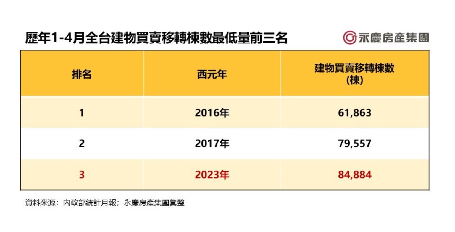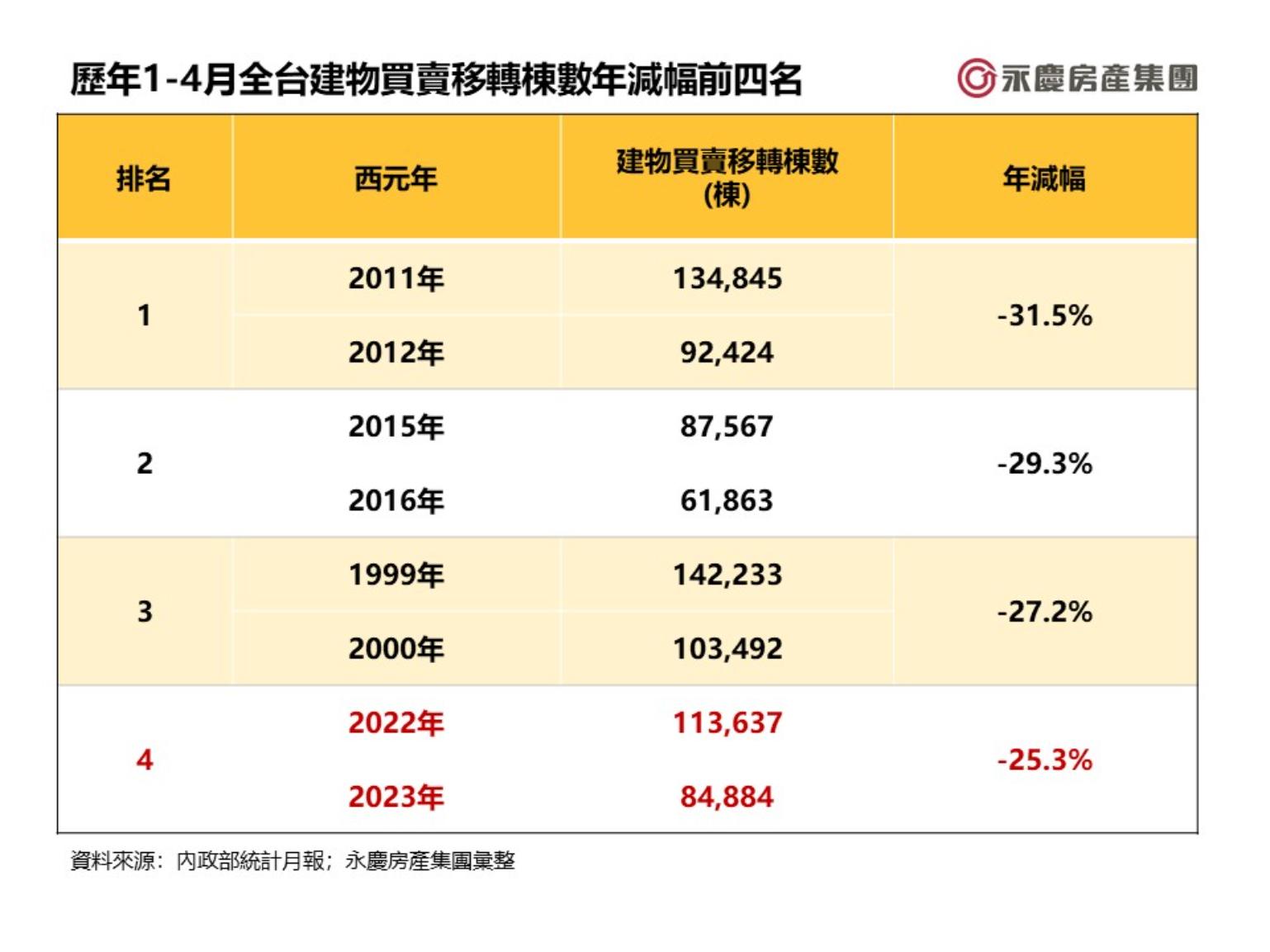 陳金萍補充,若合計今年前四月全台建物買賣移轉棟數表現,全台1-4交易量為84,884棟,與去年同期年減25.3%,是自2018年來最低交易紀錄,創六年新低,顯示今年房市交易熱度不如以往。
