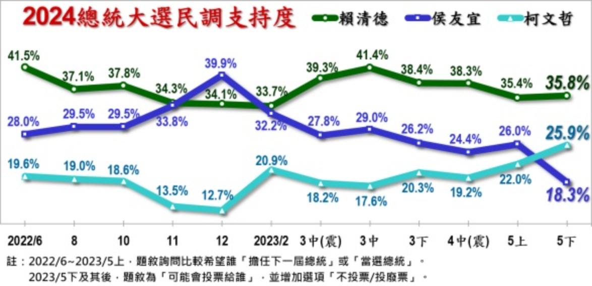 《美麗島電子報》今(29)日下午六點公布5月國政民調顯示,民進黨主席賴清德的支持度維持平盤在35.8%,但在藍營「郭侯之爭」仍未平息下,新北市長侯友宜的支持度重創至18.3%,台灣民眾黨主席柯文哲則以25.9%,超車到第二名。