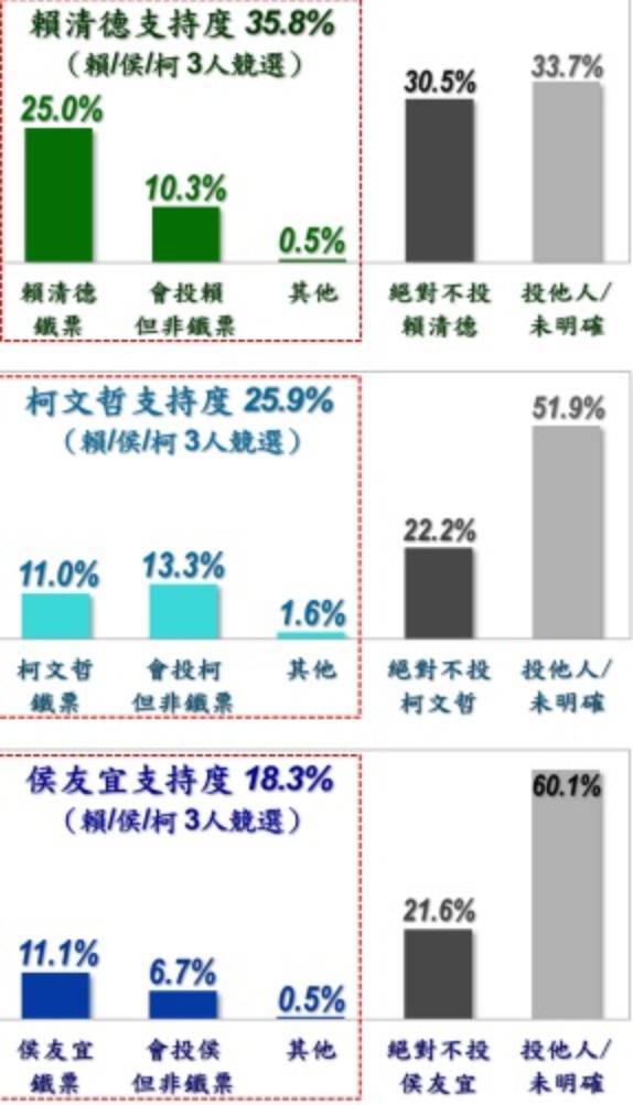 民調也特別調查三人的鐵粉比例,唯一支持賴清德的有25%,支持者凝聚力相對較高;侯友宜的鐵票為11.1%;柯文哲為11%。此外,會去投票但非任何人鐵粉的高達42.8%。