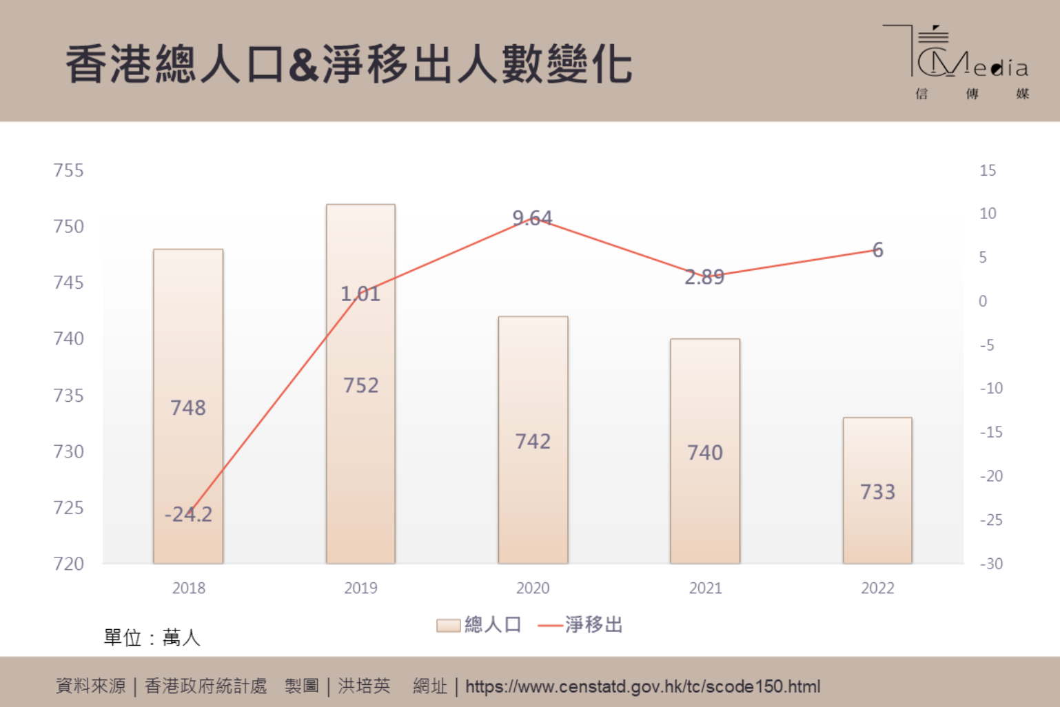 與上述資料相呼應,港府數據顯示2019-2022年移入(不含從中國移居至香港者)減去移出的「淨遷移人口」共計為負19萬5400人,且2020年(負9.64萬人)為97年回歸以來單年最大淨移出。