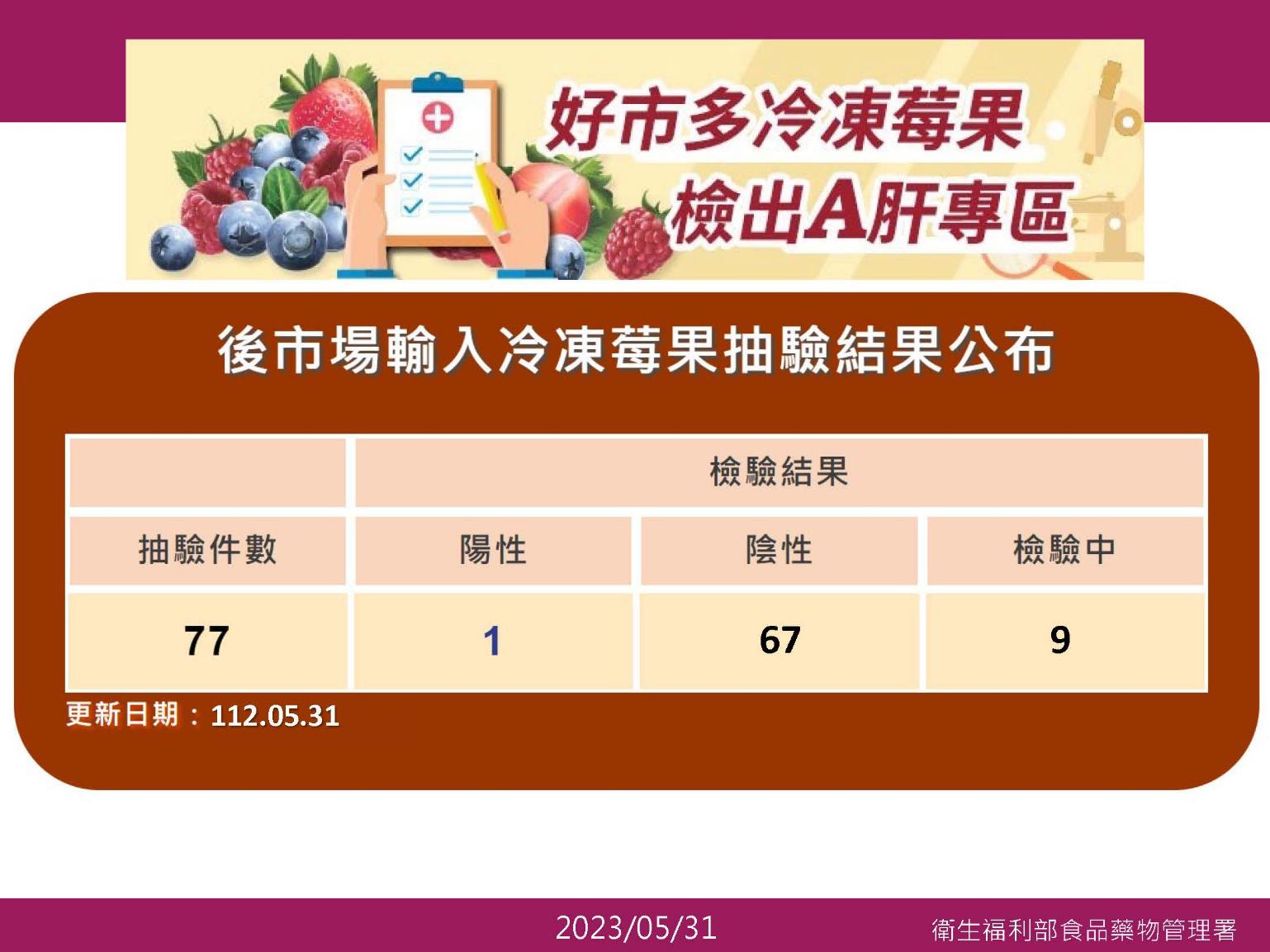 食藥署副署長林金富表示,食藥署自5月1日啟動後市場擴大抽驗計畫,全面查核及抽驗冷凍莓果之輸入商及販售業,截至今年5月30日止抽驗77件,發現1件陽性、67件陰性、9件檢驗中。本週(5月24日至5月30日)無新增陽性案件。