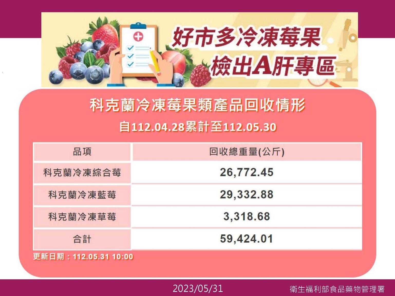 截至5月30日止,好市多公司各分店回收科克蘭冷凍莓果產品總計累計59,424.01公斤(科克蘭冷凍綜合莓26,772.45公斤、科克蘭冷凍草莓3,318.68公斤、科克蘭冷凍藍莓29,332.88公斤)。