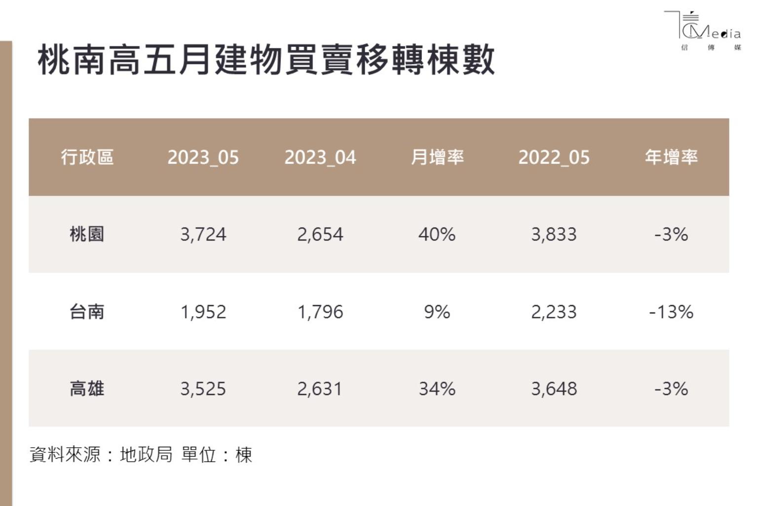 根據已公布的移轉資料顯示,桃園5月建物移轉棟數3724棟,月增4成,年微減3%,台南市1952棟月增9%,但年減13%,高雄市5月移轉棟數3525棟,月增達34%。造成月移轉棟數大增並非市場景氣變好,主要還是地政機關5月工作天數比起4月多35%而帶動。
