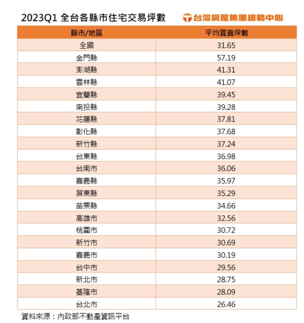 房價高,交易逐漸小宅化,根據內政部不動產資訊平台資料,2023年第一季的全台住宅交易平均坪數為31.65坪,而各縣市中,有4縣市平均小於30坪,分別為台中、新北、基隆和台北,其中以台北坪數最小,平均僅26.46。
