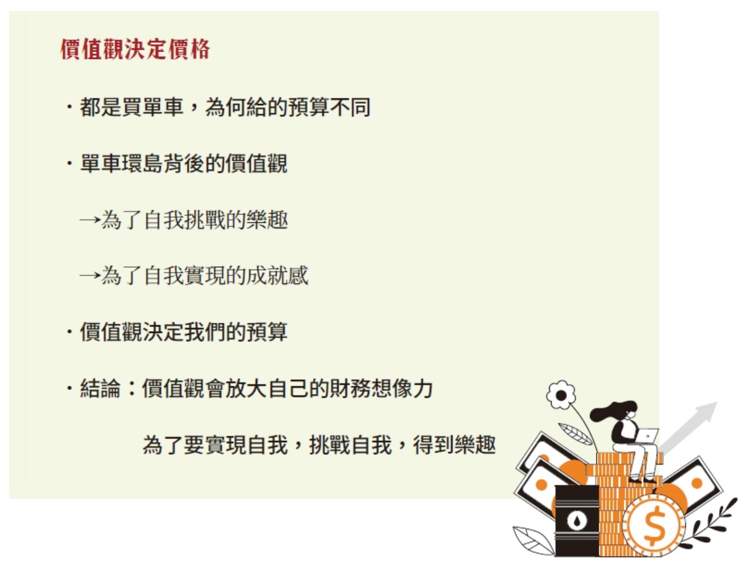 這些腳踏車的都可以達成環島的功能,但是價格差距卻很大。都是買單車,為什麼A和B花的預算不一樣?因為認為,比買單車更重要的,是背後的價值觀,是「為了自我挑戰」值多少錢,還有「為了自我實現」的成就感,成就感雖然不能用錢比擬,但是成就感重要啊!那麼,多花一點錢在上面,又有什麼問題呢?這時候,A在「買單車」時就不是單純的「買單車」而已,而是「自我實現的成就感」值得我花多少錢來實現。這時候自我實現的價值觀,決定了我們的預算。但是,金錢的使用是會有排擠效應的。如果當A刷卡花了3、40萬買腳踏車,但是下個月繳卡費時,才發現其實現金並不夠支付信用卡帳單。甚至需要去申請信貸來還清,連房租都繳不了的同時,A才發現,成就感已經排擠了生活,連活下去都有點困難時,財務已經不太對等了。