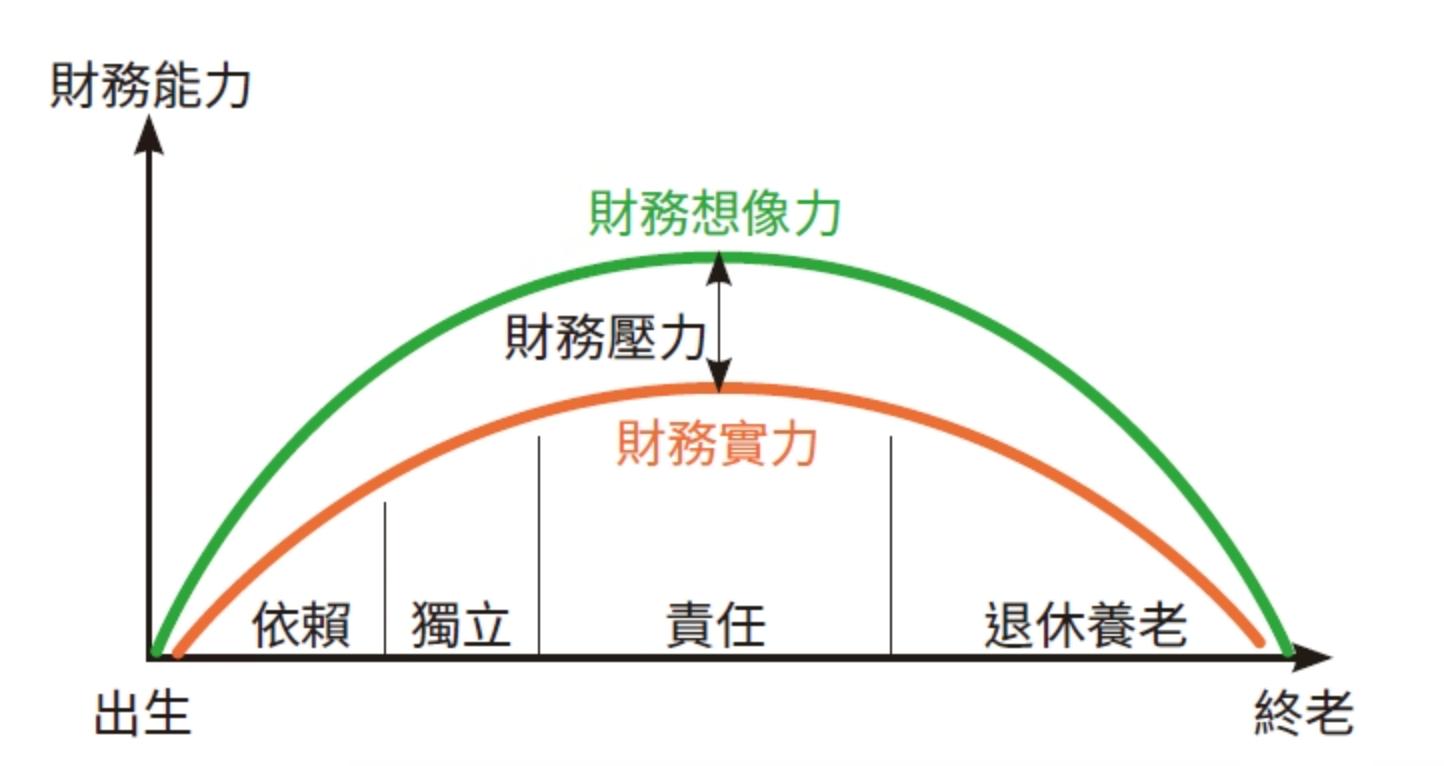 在這張圖中,我們可以看到四個財務階段,分別是依賴、獨立、責任、退休養老,每個階段都有自己的財務想像力和壓力,我們特別可以看到在責任期的財務想像力容易超出財務實力許多,這也是大部分你們的階段,是我特別想提醒讀者注意的。