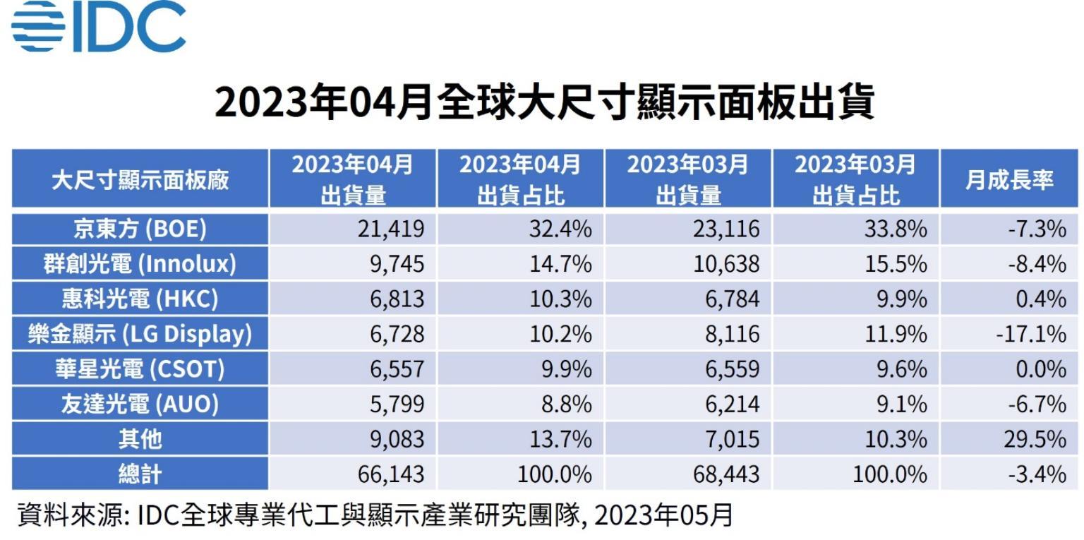 根據IDC統計,今年4月大尺寸面板出貨量為66143台、整體較上月衰退3.4%,其中京東方出貨量21419台為最高,出貨占比超過全球三成,群創、惠科、樂金LG出貨占比大約落在一成左右,其中樂金單月衰退幅度17%為最大,群創衰退8.4%第二、京東方衰退7.3%第三。