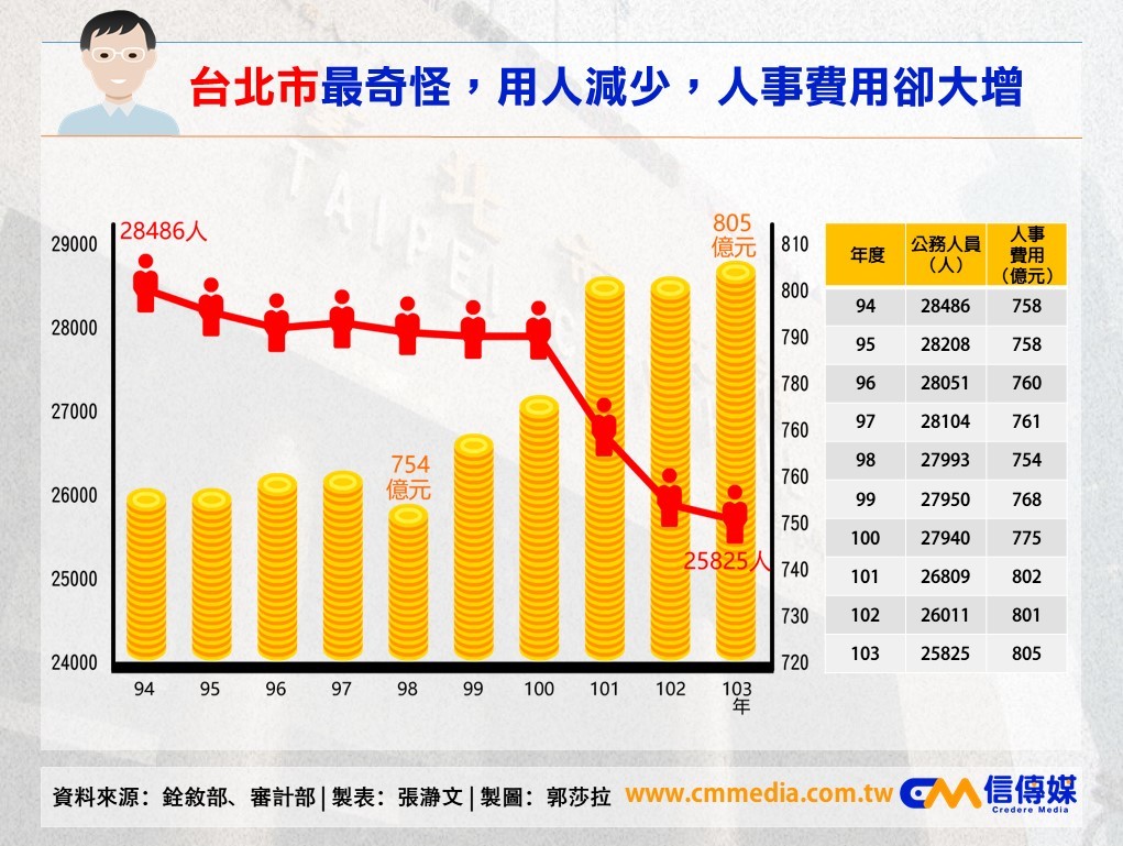 但是人減少了,人事費用卻從94年的758億元,增加至103年的805億元,10年間增加47億元、增幅6.2%,公務員人數減少,人事費用反而膨脹,台北市出現六都中最奇怪現象,這一點值得現在執政的柯文哲市長好好去瞭解。